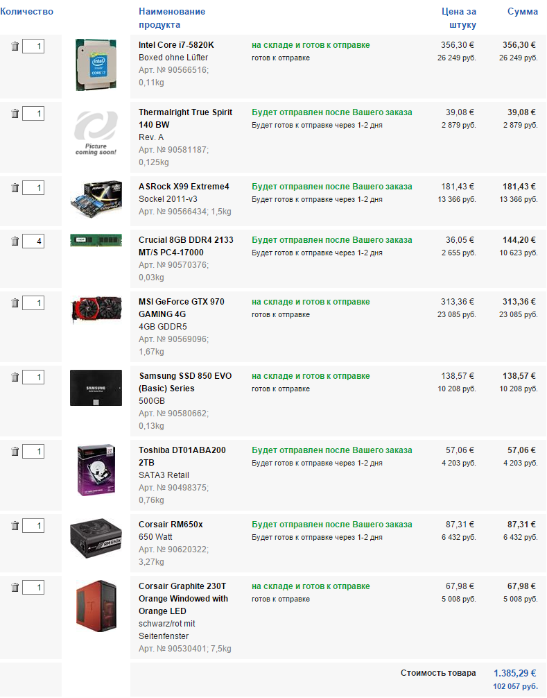 Покупаться большая часть будет в Регарде г. Москва, так как мониторинг цен (Сравнивал цены по каждому компоненту с Юлмарт, Ситилинк, ДНС, и ещё каким то) указывает, что это самый дешёвый магазин из всех. Что то будет покупаться у знакомых на пару тысяч дешевле рыночной стоимости.