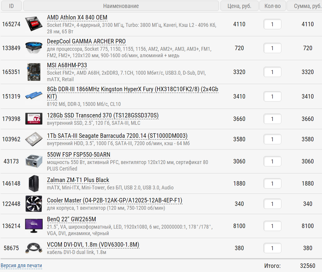 Прошу помощи в сборке системного блока для дочери, учеба в ВУЗе - программирование, создание сайтов. 1) 25000 (+6 тыс на монитор в разрешении 1920) 2) http://www.regard.ru/ Москва. 3) Системник 4) Задачи - учеба в Вузе (создание программ, сайтов), фильмы в разрешении HD, возможно игры (скорее всего ММО типа warcraft) 5) Разгона не будет точно 6) Апгрейд не планируется 7) Теоретически возможно установка старой видеокарты - Nvidia 450 GTS (512 МБ), но я думаю сейчас встроенное в процессор видео уже получше будет. 8) Если у Вас есть какое либо требования, уточняйте: Нет 9) Наброски конфигурации ПК Смотрел по тестам - склоняюсь к процессорам AMD FM+ (A8 - 7600) т.к. там уже встроенный видеоадаптер, можно сэкономить) Если можно вписаться с SSD было бы здорово. Для экономии - корпус с блоком питания я думаю. Думаю нужна встроенная видеокарта, но чтобы была возможность установить дискретную. В основном требования к процессору