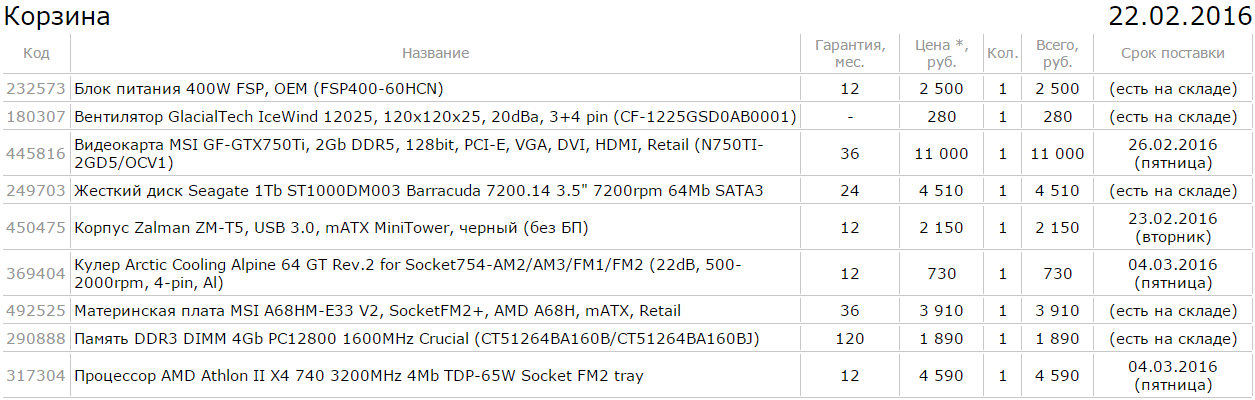 Конечно, лучше бы было на i3, да и БП я минимальный поставил - лучше тот же FSP500-60HCN. Но компьютер - это вещь не первой необходимости, можно и таким конфигом обойтись на первое время, а дальше - видно будет.