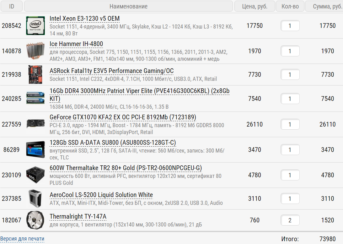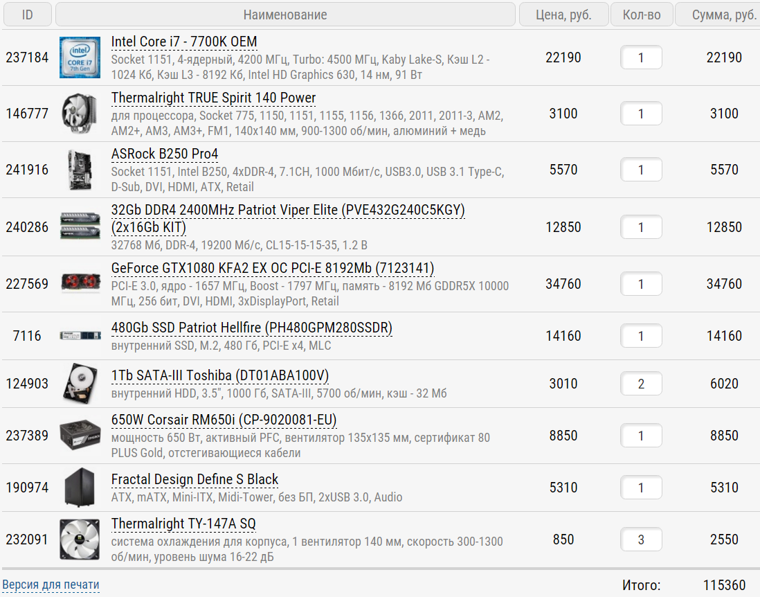 ComputerUniverse - взвесил все за и против, оттуда брать не буду, поэтому бюджет рассчитываю по Москве (юлмарт,регард,днс и другие схожие. Плеер.ру смотрел, цены на 1-3к меньше, но судя по отзывам там товар левый и не возвращают как другие в случае брака или еще чего нибудь) Ну вот собственно вопрос заключался в том, при 6700к и 1070 под z170 чипсет(асрок fatality gaming k4 -самый дешевый из всех) можно будет уложиться в 70-75к? При том что будет 8х2gb оперативка 2400/2133(разницу так и не понял, кроме цены в +1к), ссд самсунговский (hdd свой старый поставлю пока не накоплю). И если нет то на чем и как сбавлять стоимость? Из вариантов в голове- кулер слабее без разгона проца, бп брать только под эту сборку (калькуляторы выдают макс 400-450, т.е. 500-600w + сертификат хотя бы бронзовый), корпус подешевле, оперативку не 2400 а 2133.