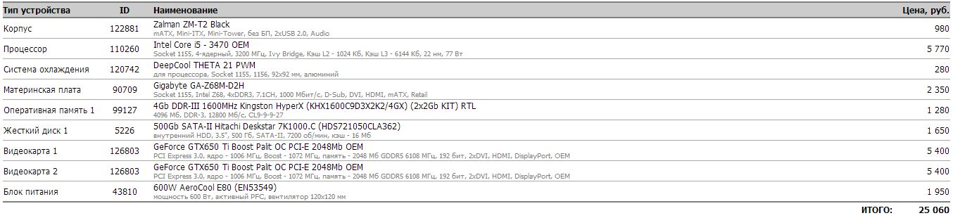 Модуль памяти CORSAIR Vengeance CML16GX3M2A1866C10 DDR3- 2x 8Гб, 1866, DIMM, Ret = 4560 руб Материнская плата ASUS F2A85-V Socket FM2, ATX, Ret = 3130 руб Оптический привод DVD-RW PLEXTOR PX-891SA = 1110 Процессор AMD A10 5700, SocketFM2, BOX [ad5700okhjbox] = 4060 руб Монитор ЖК SAMSUNG S23B370H «R», 23", черны = 6490 руб Жесткий диск 3.5" HITACHI Deskstar 7K1000.D HDS721010DLE630 = 2330 руб Блок питания HIPER V500, 500Вт, 140мм, черный, retail = 1700 руб Корпус ATX EZCOOL NA-750R, Midi-Tower, без БП = 880 руб итог = 24260 руб