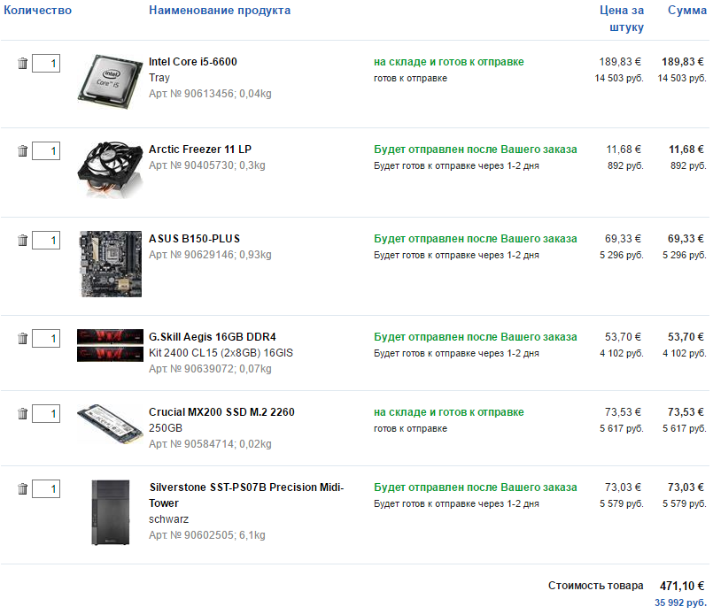 Гнать не буду, поэтому без К. 6500 и 6600 разница 1000 руб. Стоит переплатить? У кулера вроде площадка медь, трубки - всё ок. Или другое рассмотреть? Мать устраивает, покритикуйте. ОЗУ идеальна. Всё остальное буду в СПБ брать. Корпус - отзывы хорошие. Может есть какой-нибудь аналог SSD? Просто в наличии его нет, а ждать дополнительно 2 недели долго. Тем более заказ формируется после оплаты, вдруг какие косяки. Посоветуйте под эту сборку видеокарту. Собираюсь заказывать на CU. Кто там заказывал? Стоит ли экономия денег ожидания и рисков связанных с Почтой России.