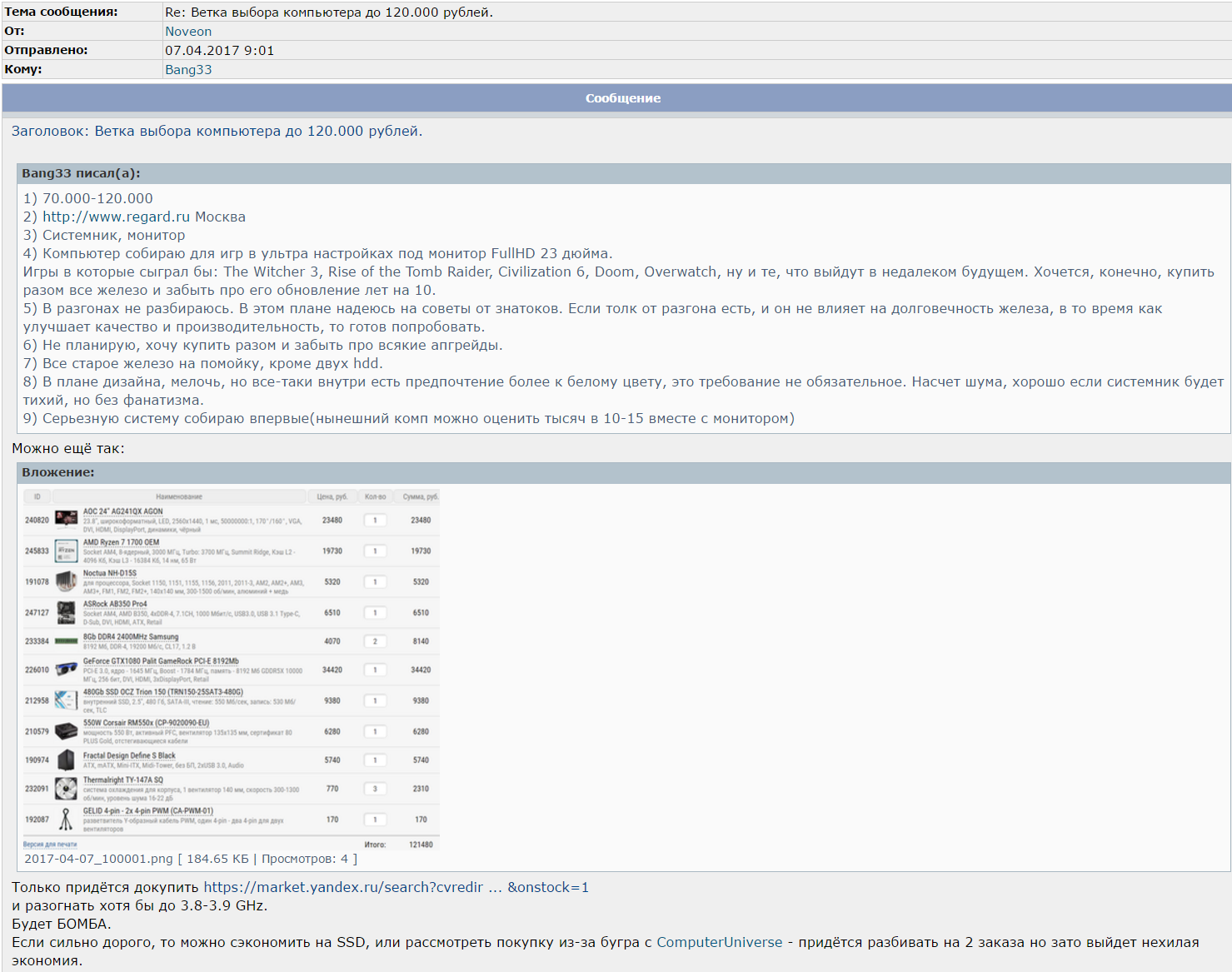 Господа, только не ругайтесь, железки не стоят того, чтобы портить из-за них отношения. К слову, я еще долго буду выбирать, планирую покупать компьютер в конце мая-начале июня. По вашим рекомендациям вижу, что вы хотите меня склонить больше в сторону Ryzen и GTX1080. Но мне не нужны супер-пупер показатели FPS, достаточно игры с хорошей картинкой без тормозов.