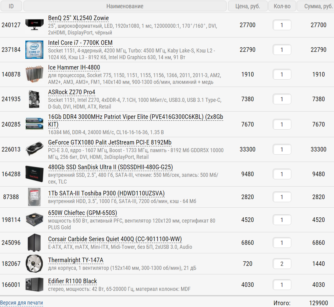 Процессор: i7 - 7700k (ситилинк) Мамка: ASUS Z170 PRO GAMING LGA 1151 (ситилинк) Видяшка: GIGABYTE GeForce GTX 1080 Ti (юниверс) Оперативка: CORSAIR Vengeance LED CMU32GX4M2C3000C15R DDR4 - 2x 16Гб 3000, DIMM, Ret либо CORSAIR Vengeance LPX CMK32GX4M2A2400C14R DDR4 - 2x 16Гб 2400, DIMM, Ret SSD: 950 EVO m2 (юниверс) БП: Thermaltake Toughpower Grand RGB 80+ Gold 750 Watt (юниверс)