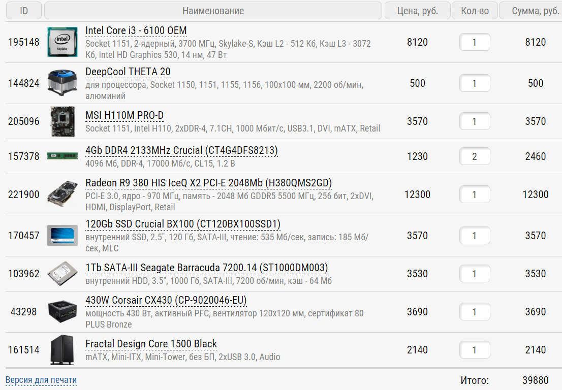 Cinzento Пришлось пустить "под нож" вторую планку памяти и HDD, так что лучше запланируйте апгрейд на это дело, а то сэкономить около 6 килорублей в принципе можно, но будет в ущерб производительности и\или надёжности (ради невылезания из верхней планки вашего бюджета пришлось даже чуть сэкономить на корпусе, но из недостатков там только отсутствие каких-либо виброгасящих подкладок на креплениях HDD). Регард: