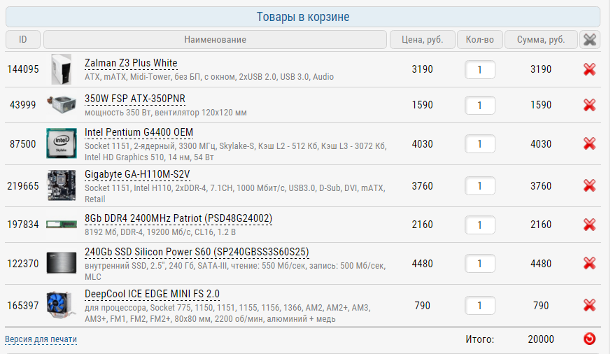 MiLorDrs В разных городах цены разные, поэтому смотрите у себя что почем : Процессор i3-6100 box Материнская плата ASUS H110M-A Память Samsung DDR4 2133 мгц 8 gb SSD Samsung 850 Evo 120 Gb HDD WD Blue 1 Tb Корпус Zalman ZM-T5 БП FSP-350 PNR