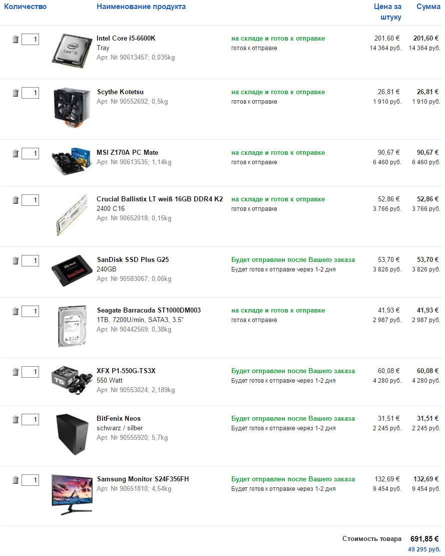 ИТОГО: 1166 € (с монитором), 940 € (без монитора).