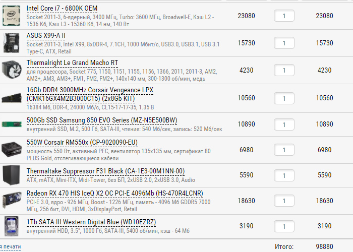 1) 94,000 рублей (на CU включая доставку) 2) https://www.computeruniverse.ru Или в Москве, в любом интернет-магазине, где дешевле выйдет 3) Только системник 4) Тяжелые современные (AAA) игры на максимуме и 60фпс в FullHD (ведьмак3, баттлфилд и другие) (4k в далекой перспективе, на настройках пониже) 5) Разгон возможен 6) апгрейд не планирую года 3 7) Железа нету 8) Требования: производители любые SSD 240 GB HDD 1 TB RAM 16 GB WLAN a\b\g\n\ac (отдельный покупать не хочется) Bluetooth (джойстик подключать) Шум хотелось бы поменьше при играх на максималках (PS4 фатка например сильно шумит) Корпус хотелось бы поменьше (в идеале https://www.computeruniverse.ru/product ... dition.asp в таком корпусе, чтоб как приставка размером, но характеристики тогда хуже будут? шуметь будет ощутимо? тогда не надо) Подсветки в корпусе быть недолжно или чтобы не всю комнату освещала хотяб))