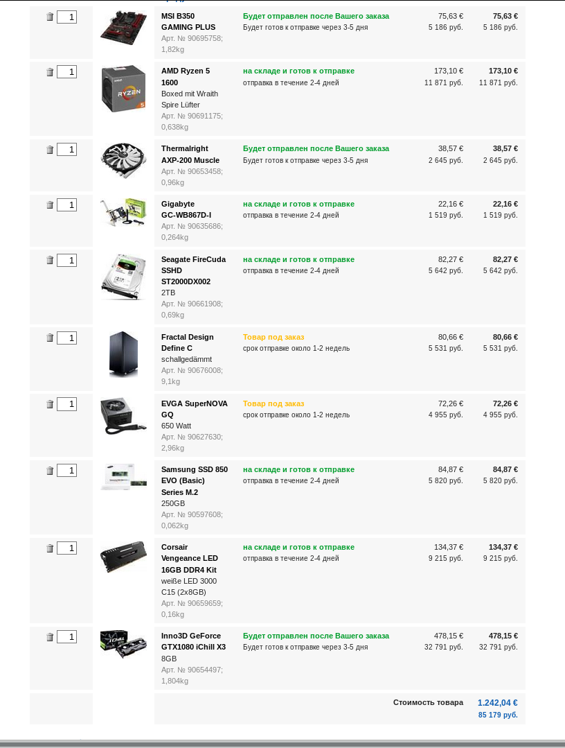 не уверен в выборе: мать - выбрал с запасом по разъемам RAM - с памятью самсунг не нашел в CU (подумал лучше взять все в одном магазине), выбрал 3000 мгц, но она с памятью от Hynix, разгонять ее не собираюсь, пойдет под такой проц? кулер - просто взял такой же как посоветовал Noveon для другого корпуса, сюда такой пойдет или другой посоветуете? видеокарта - разница с 1070 всего 3к, выбрал 1080, разгонять не буду, в корпусе Fractal Design она не будет сильно шуметь? БП - для 1080 на 50 ватт больше выбрал, нормальный БП? какие еще кулеры в корпус добавить, чтоб попрахладней и потише? посылку буду разбивать на части так что можно свыше 1000 евро корзину