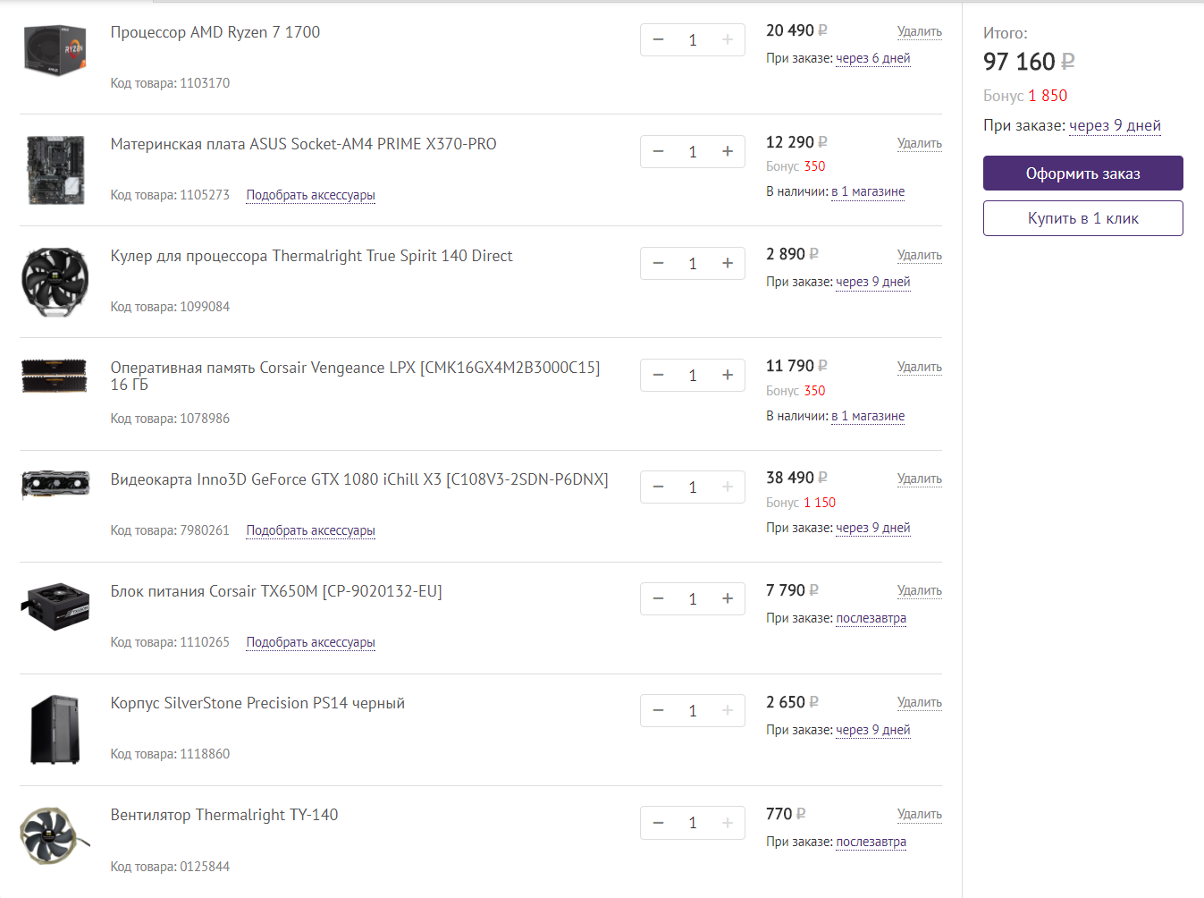 https://www.dns-shop.ru/custompc/config ... 3518ef62b/ Процессор AMD Ryzen 7 1700X Материнская плата ASUS Socket-AM4 PRIME X370-PRO Видеокарта Asus GeForce GTX 1080 STRIX [STRIX-GTX1080-A8G-GAMING] Корпус Zalman Z3 Plus черный Кулер для процессора DEEPCOOL GAMMAXX S40 Оперативная память Corsair Vengeance LPX [CMK16GX4M2B3000C15] 16 ГБ Блок питания Corsair CX 650W [CP-9020122-EU]