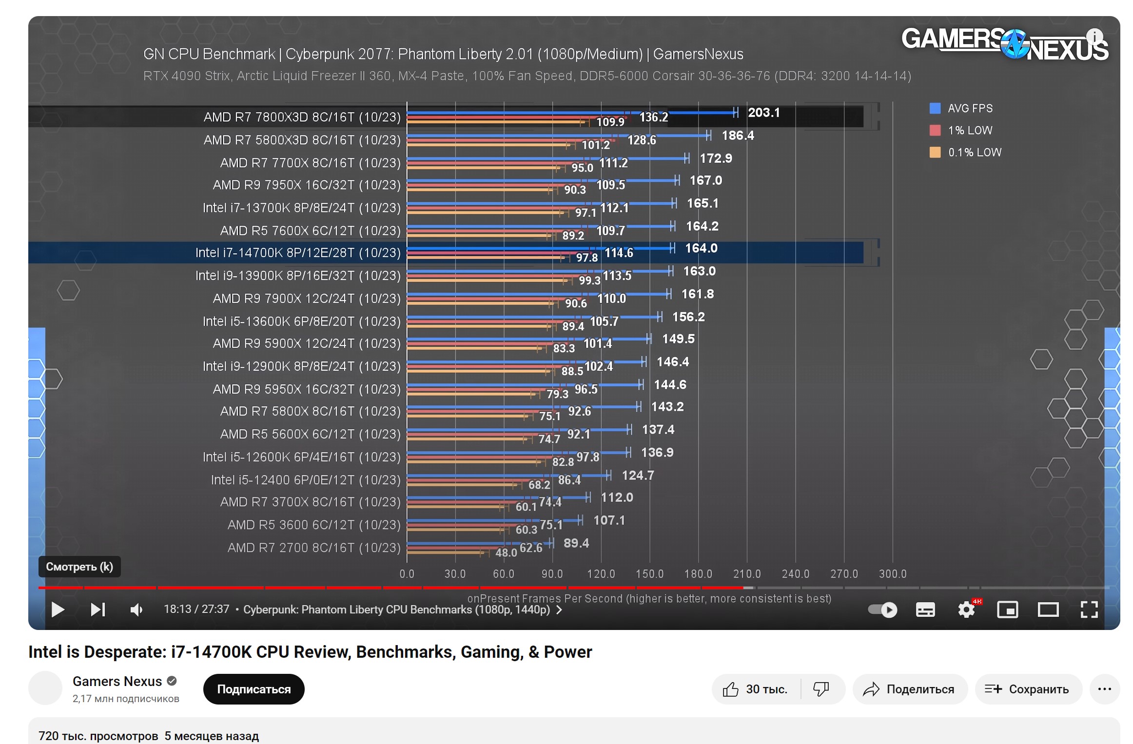 В каких? В онлайн пострелушках,? При всех достоинствах того же 7800x3d, при том, что его сейчас вполне можно назвать лучшим процессором для игр, есть достаточно игрушек, где он сливает процам от Intel, так как в этих играх кеш перестаёт быть такой киллер фичей.