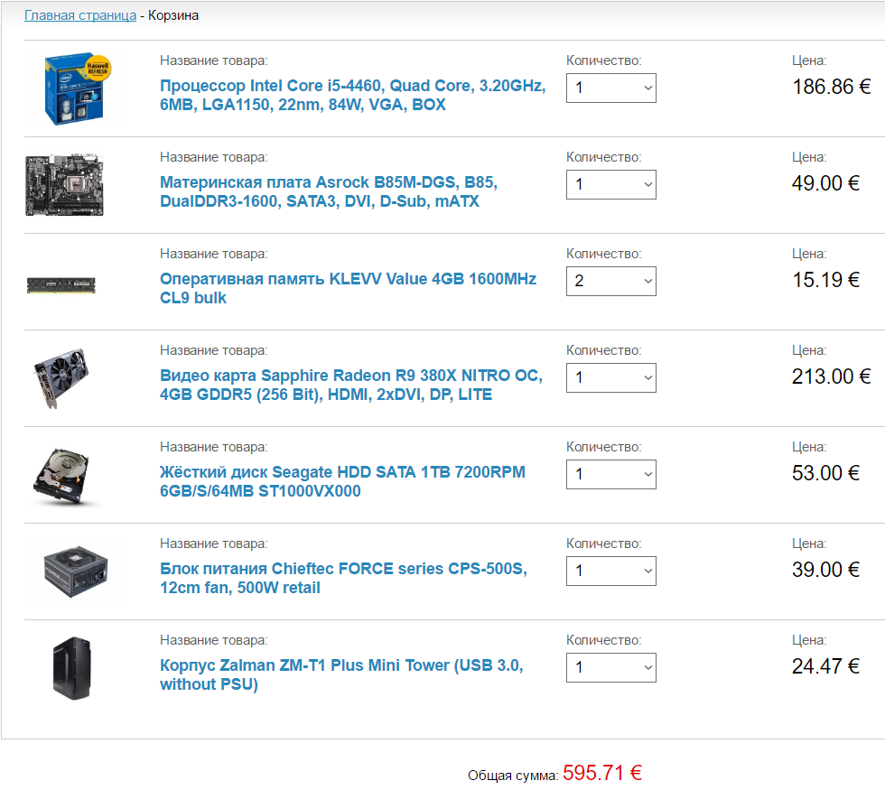 Nimtol можно и skylake Процессор Intel Core i5-6400, Quad Core, 2.70GHz, 6MB, LGA1151, 14nm, 65W, VGA, BOX 188евро Материнская плата Asrock B150M-HDS, B150, DualDDR4-2133, SATA3, HDMI, DVI, mATX 60 евро Оперативная память Crucial 8GB 2133MHz CL15 1.2V, Dual rank 31евро Жёсткий диск Western Digital Caviar Blue WD10EZEX 1TB 64MB SATA 6 Gb/s 46 евро Корпус Zalman ZM-T1 Plus Mini Tower (USB 3.0, without PSU) 24,47евро Блок питания Chieftec FORCE series CPS-500S, 12cm fan, 500W retail 39евро видеокарту ждать rx 470 4gb/8gb в течении месяца.