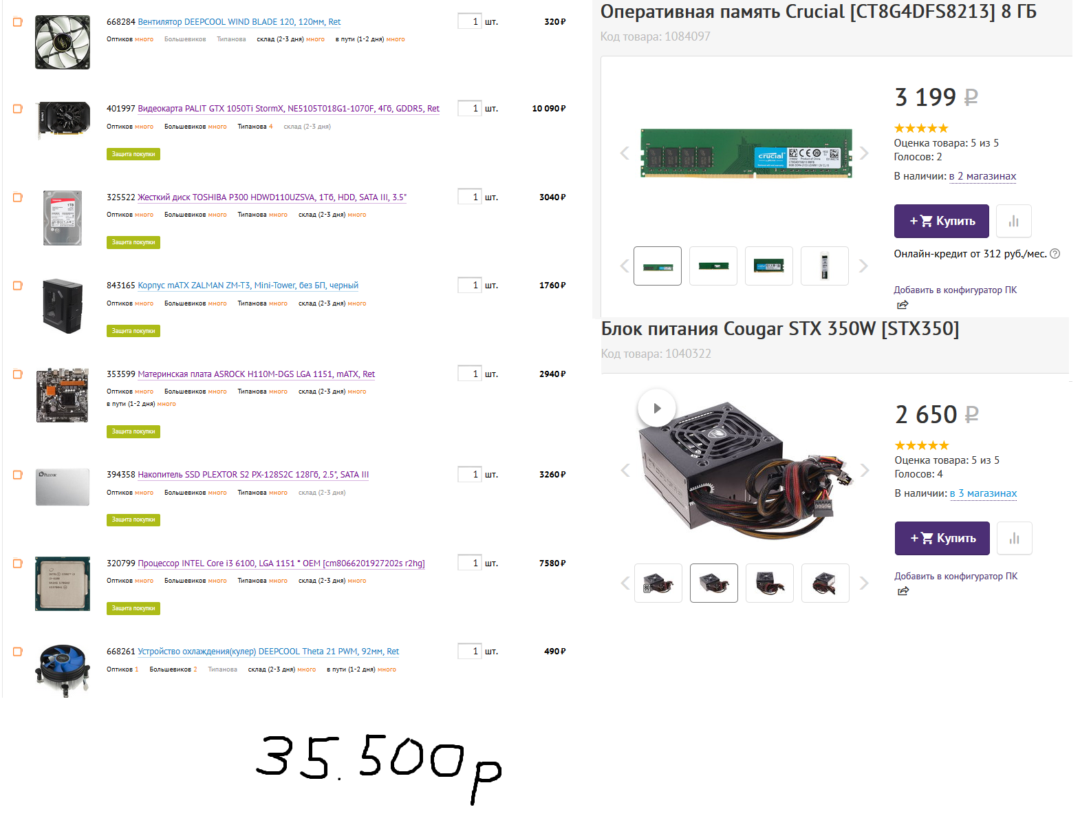 Процессор INTEL Core i5 7600, LGA 1151 ** OEM [cm8067702868011s r334] 15 950руб Материнская плата ASUS PRIME B250-PLUS LGA 1151, ATX, Ret 6550руб Устройство охлаждения(кулер) TITAN TTC-NA02TZ/RPW1, 95мм, Ret 590руб Видеокарта PALIT PA-GTX1060 StormX, NE51060015J9-1061F, 6Гб, GDDR5, Ret 16 750руб Модуль памяти PATRIOT Signature PSD48G240081 DDR4 — 8Гб 2400, DIMM, Ret 3860руб Модуль памяти PATRIOT Signature PSD48G240081 DDR4 — 8Гб 2400, DIMM, Ret 3860руб Жесткий диск WD Blue WD20EZRZ, 2Тб, HDD, SATA III, 3.5" 4720руб Накопитель SSD PLEXTOR M6G Plus PX-128M6G+ 128Гб, M.2 2280, SATA III 3850руб Корпус ATX ACCORD ACC-B307, Midi-Tower, без БП, черный 1160руб Блок питания FSP 600PNR-I, 600Вт, 120мм 2990руб Итого 60 280р. Оцените сборку: сбалансированность, соотношение цена/производительность, где можно сэкономить, а где лучше добавить. Смотрел в ситилинке (Уфа). Но меня интересуют конкретные комплектующие, если что буду заказывать в других местах. Бюджет около 60 т.р. Разгон не планируется. Заранее спасибо за помощь!!!