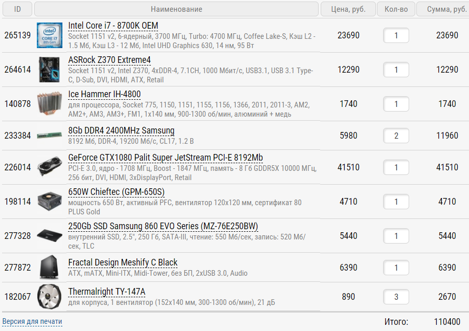 Сам себе накидал такое, но с удовольствием выслушаю рекомендации. Корпус 232963 3Cott 1815 Black ATX, mATX, Midi-Tower, без БП, USB 2.0, USB 3.0, Audio Процессор 263707 Intel Core i7 - 8700K BOX (без кулера) Socket 1151 v2, 6-ядерный, 3700 МГц, Turbo: 4700 МГц, Coffee Lake-S, Кэш L2 - 1.5 Мб, Кэш L3 - 12 Мб, Intel UHD Graphics 630, 14 нм, 95 Вт
