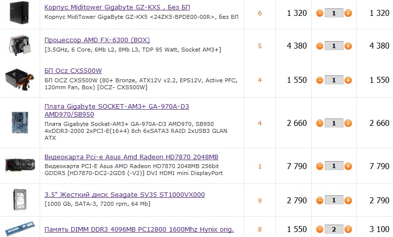 2. Вот что набросал сам на асусе: процессор AMD FX-6300 Black Edition, BOX материнская плата ASUS M5A97 EVO R2.0 DIMM DDR3, 8ГБ, Kingston HyperX blu, KHX1600C10D3B1/8G, BOX блок питания ATX Corsair CX 600, CP-9020048-EU, 600W ASUS HD7850-DC2T-2GD5-V2, HD 7850, 2048МБ, GDDR5, Retail корпус ZALMAN Z12 выходит на 3 000 дороже первого варианта.