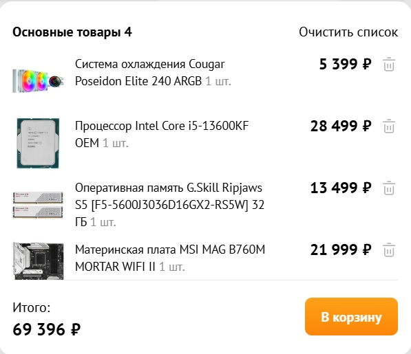 Оптимум для 1700го это 12700K(F) но есть ньюанс, точнее куча: во первых у вас корпус mATX с низким кулером - водянка просится что а принципе неплохо, но многие боятся, опять же подобные корпуса-аквариумы часто берут для эстетики, так что водянка просится а лезет что наверх что на боковину(тут, кстати, обидно что фильтра нет, так что по хорошему на выдув, но там еще тот вопрос по потокам будет) только 240; 4070 Ti простая и 4к тяжеловато сочетаются, так что видяха одно из слабых мест, но и менять сейчас не лучшее время - 4070 Ti|4080 Super это грубо две цены вашей а выхлопа такого не будет, что будет в 50й серии с ценами и производительностью пока вопрос, но логично отложить, в итоге видется что-то типа Проц https://www.wildberries.ru/catalog/2974 ... etail.aspx 23к - цена хватай-беги, но прямо сейчас Мать https://www.ozon.ru/product/msi-materin ... 1637461819 18,5 - есть PCI-E 5.0(не сказать что необходимость, но чтоб хоть было ощущение что не зря менял сокет) и хороший питальник Память https://www.dns-shop.ru/product/2e51395 ... 48-gb/21,8 цена нормальная для такого сочетания частоты/таймингов и с нормальной гарантией(на маркетплейсах и 5 лет не всегда есть), объем тоже с запасом, если кажется излишним то https://www.wildberries.ru/catalog/1706 ... etail.aspx 12,9к Охлаждение - вот тут проблема, типовой вариант DEEPCOOL LS(LT)520 ~11к в DNS, брать лучше в локальном магазине с гарантией 5 лет ради помпы. Естественно прирост пропорциональным разнице с продажей текущего железа не будет и рядом, но это всегда так...