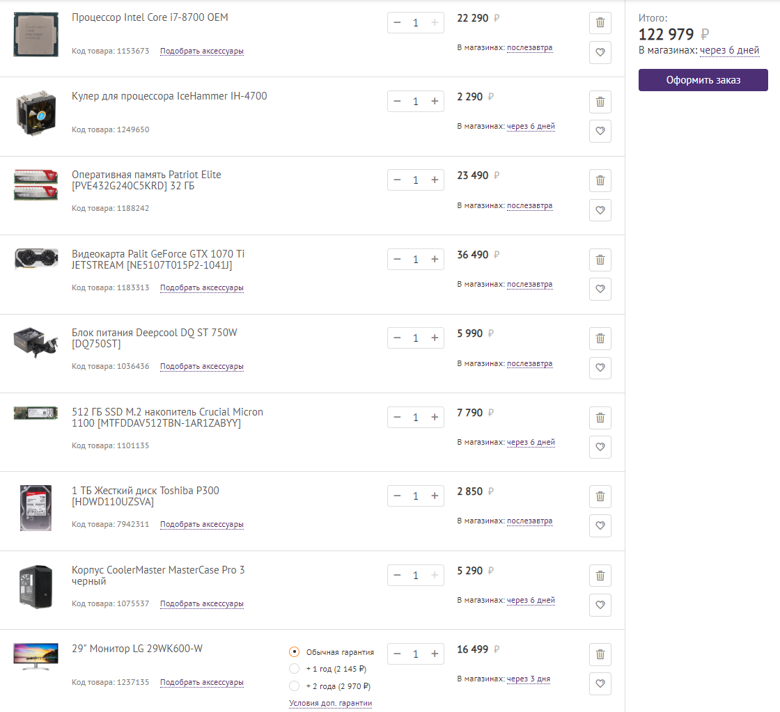 DalwJoker раз будешь сам по магазикам смотреть, то вот просто список: Процессор Intel Core i7 - 8700K OEM Кулер Noctua NH-U14S Материнская плата ASRock Z370 Extreme4 Оперативная память DDR4 8Gb 2666MHz PC-21300 Samsung = 2 шт. Видеокарту ты выбрал норм, но можно поискать и подешевле, например ту же KFA. SSD 860EVO того объёма, на какой денег не жалко HDD 5400-5940rpm 3.5" того объёма, на какой денег не жалко))) Блок питания 650W Corsair RM650x (CP-9020091-EU) Корпус Be Quiet Dark Base 700 + второй такой же кулер на морду be quiet! Silent Wings 3 (BQ SIW3-14025-HF-PWM)