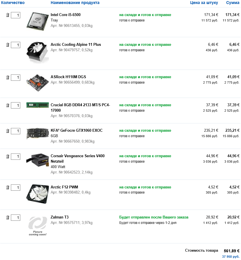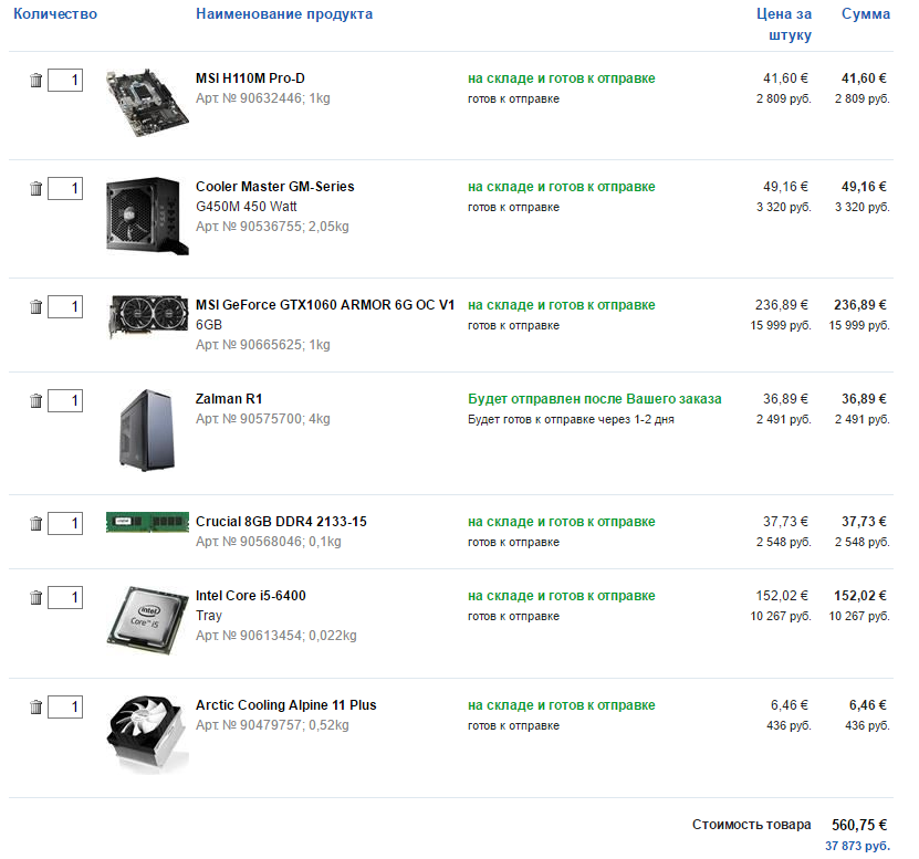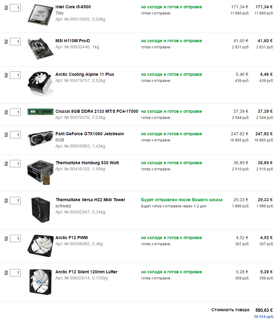 MSI H110M PRO-D Артикул 3695323 3 690 руб. DIMM DDR4, 8ГБ, Kingston KVR24N17S8/8 Артикул 4026356 3 770 руб. жесткий диск HDD 1ТБ, Western Digital Blue, WD10EZEX Артикул 332498 3 540 руб. корпус ZALMAN Z1, w/o PSU, black Артикул 3412509 2 810 руб. Видеокарта Gigabyte GeForce® GTX 1060, GV-N1060WF2OC-3GD, 3ГБ, GDDR5, Retail Артикул 3991412 16 880 руб. процессор Intel Core i3-6100, BOX Артикул 3620019 8 690 руб. блок питания ATX High Power 600HPC 600W Артикул 237554 3 610 руб.