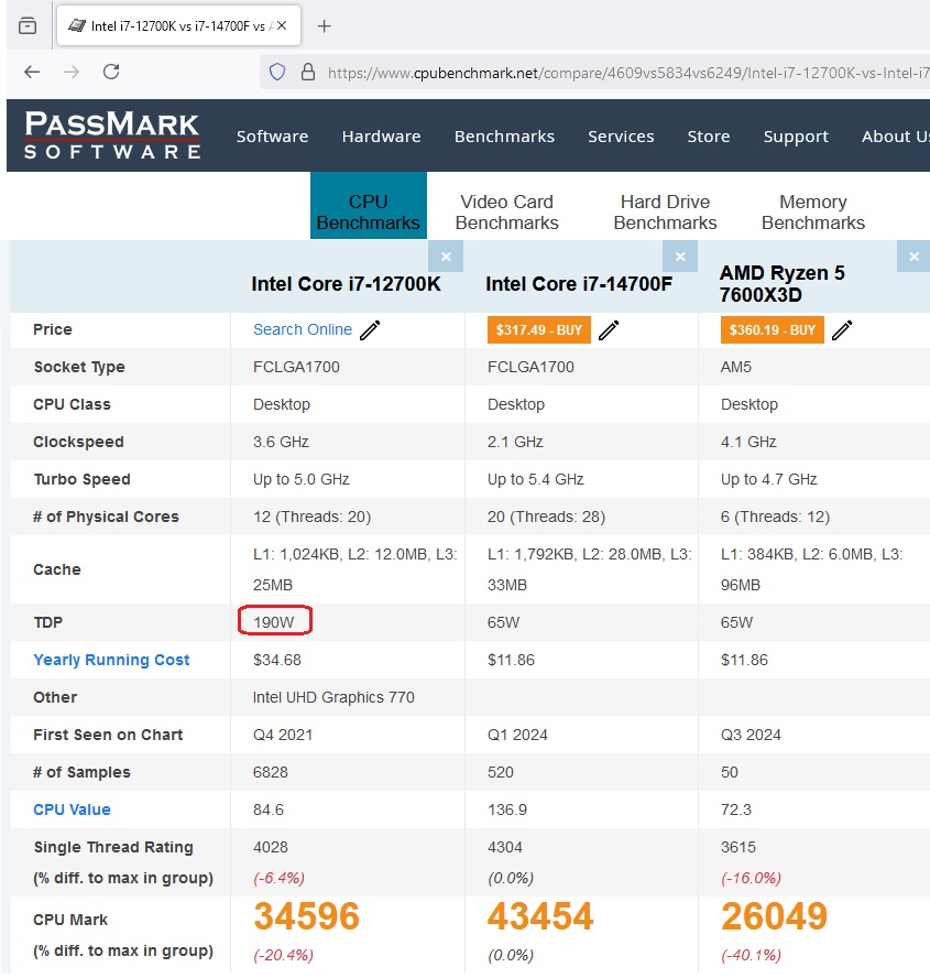 Ты бред написал, выделив на своем скрине TDP 190W у i7-12700K. В реальности TDP у i7-14700F будет больше, чем у i7-12700K. О 65 Вт можно забыть.