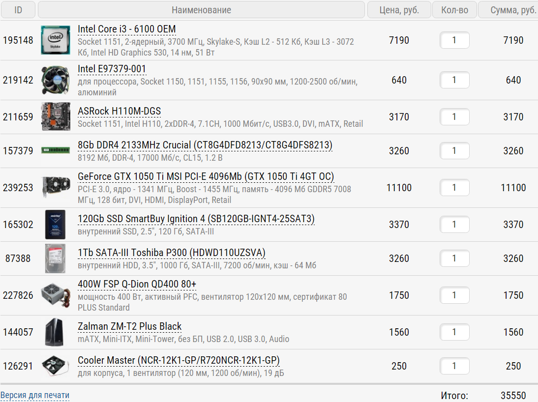 paparazzi1988 , Большое спасибо за сборку. Я ее немного изменил, вышло на 32.5К. Появились вопросы. Народ, подскажите пожалуйста: 1. Стоит ли брать этот БП ? Все таки он на 500W а моей системе, (как Я понимаю) больше 300W не требуется. Можете ли порекомендовать так сказать какой нибудь "народный" БП, чтоб ничего не сгорело и чтоб не очень дорого)) Из магазинов: Ситилинк, Юлмарт, Полюс. 2. С видюхой Я вроде определился. Это 1050ti. Стоит ли брать вот эту от палит с двумя куллерами, или лучше взять стормХ с одним? Или может стоит взять вообще от другого производителя? 3. Стоит ли прикупить доп куллеры в корпус (по мимо 1 куллера на проце и 1 на корпусе)? 4. Если взять другой куллер на проц, с регулируемыми оборотами, то как он будет работать? Будет ли он менять скорость автоматически, в зависимости от температуры проца, или мне нужно самому выставлять скорость? Стоит ли взять другой куллер? 5. Нужен ли куллер для охлаждения HDD или и так сойдет?) 6. У меня есть звуковая карточка asus xonar dg. Стоит ли ее ставить, или встроенный звук по качеству не хуже? Заранее спасибо)