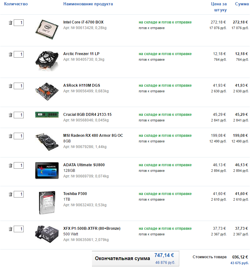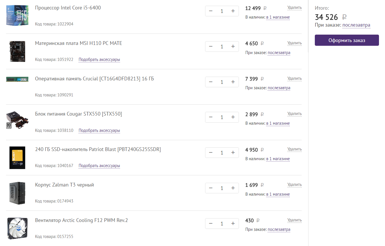 1 ТБ Жесткий диск Toshiba P300- 3 299 руб. Материнская плата MSI H110M PRO-VD- 3 350 руб. Кулер для процессора GELID Snow Storm(с запасом 150 вт охлаждение)- 1 699 руб. Процессор Intel Core i3-7100- 8 199 руб. 128 ГБ SSD-накопитель AData SP900- 4 650 руб. Блок питания Aerocool KCAS 500W [KCAS-500W] - 2 699 руб. Оперативная память Patriot Viper 4 [PVE416G213C4KGY] 16 ГБ - 7 999 руб. Видеокарта Palit GeForce GTX 1060 DUAL 6G [NE51060015J9-1061D] -16 999 руб. ИТОГО: 48894 руб. Корпус - ??