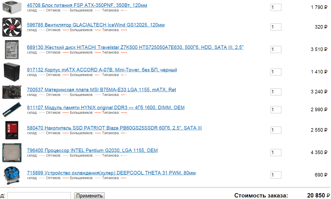 Sultan_SPb вот мой вариант: 796400 Процессор INTEL Pentium G2030, LGA 1155, OEM = 4 350 РУБ. 715899 Устройство охлаждения(кулер) DEEPCOOL THETA 31 PWM, 80мм = 690 РУБ. 700537 Материнская плата MSI B75MA-E33 LGA 1155, mATX, Ret = 3 240 РУБ. 811107 Модуль памяти HYNIX original DDR3 — 4Гб 1600, DIMM, OEM = 2 990 РУБ. 580470 Накопитель SSD PATRIOT Blaze PB60GS25SSDR 60Гб, 2.5", SATA III = 2 550 РУБ. 689130 Жесткий диск HITACHI Travelstar Z7K500 HTS725050A7E630, 500Гб, HDD, SATA III, 2.5" = 3 510 РУБ. 45708 Блок питания FSP ATX-350PNF, 350Вт, 120мм = 1 790 РУБ. 917132 Корпус mATX ACCORD A-07B, Mini-Tower, без БП, черный = 1 410 РУБ. 596785 Вентилятор GLACIALTECH IceWind GS12025, 120мм = 320 РУБ.