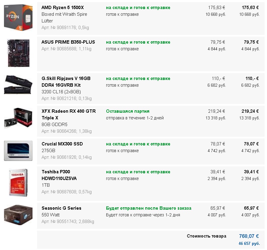 Awesome computeruniverse ASRock H110M-DVS R3.0 43,28 euro Intel Core i7-7700 4 core (Quad Core) CPU with 3.60 GHz 264 euro Arctic Cooling Alpine 11 Plus 6.55 euro MSI Radeon RX 470 GAMING X 8G 8.0 GB OC Mid Range видеокарта 200.76 euro Crucial DDR4 2133MHz CT16G4DFD8213 16GB 88.15 euro be quiet! System Power 8 80+ 500 Watt 41.93 euro Toshiba SSD A100 240GB 66.3euro Toshiba P300 HDWD110UZSVA 1TB 39.41 итого 750euro если собирать на amd, то или r5 1600 или r5 1500 AMD Ryzen 5 1600 6 core (Hexa Core) CPU with 3.40 GHz, Да 209euro ASUS PRIME B350-PLUS 79.75 euro MSI Radeon RX 470 GAMING X 8G 8.0 GB OC Mid Range видеокарта 200.76 euro Crucial DDR4 2133MHz CT16G4DFD8213 16GB 88.15 euro (хотя с памятью на 3200 будет побыстрее) be quiet! System Power 8 80+ 500 Watt 41.93 euro Toshiba SSD A100 240GB 66.3euro Toshiba P300 HDWD110UZSVA 1TB 39.41