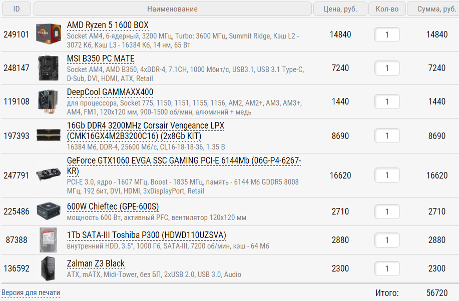 Со сборкой на Интеле вроде определился, опираясь на Ваши бесценные советы. Проц: Intel Core i7 7700K Мать: Asrock H110M-DGS R3.0 БП: Chieftec GPE-600S Кулер: Thermalright True Spirit 140 или Thermalright Macho Direct Память: Corsair Vengeance LPX DDR4 2x8gb 2400 или Crucial DDR4 2x8gb 2133 SSD: Adata SU800 128 gb HDD: Toshiba P300 1 TB Видеокарта: Palit GeForce GTX 1060 Super Jetstream 6.0 или XFX Radeon RX 480 GTR