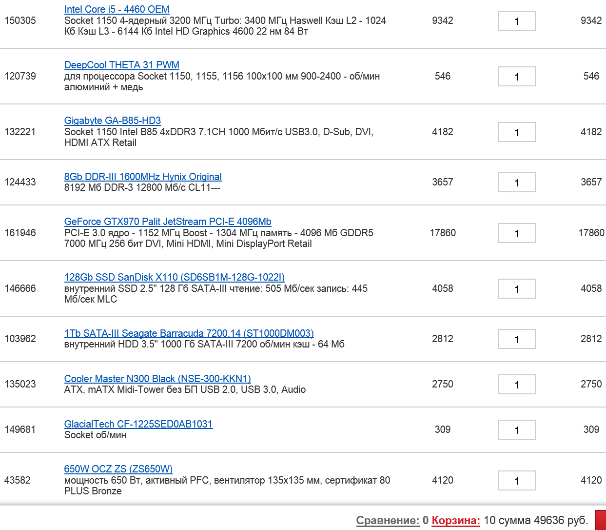 1) 30к 2) http://www.dns-shop.ru/ Нижний Тагил 3) Только системник, без жёсткого диска и внешней видеокарты 4) Интернет, видеозвонки по скайпу, офисные приложения, игры после покупки видеокарты в течение года. 5) Разгон не планируется. 6) В течение года планируется докупить жесткий диск и видеокарту. 7) Уже есть SSD Samsung 850 EVO на 250GB. 8) Хочется тихую систему. 9) Набросал вот http://dns-shop.ru/catalog/cart/?cart_i ... 1,177249-1 Процессор intel Core i5-4460 OEM Материнская плата ASUS B85M-G Кулер CoolerMaster X Dream i117 RR-X117-18FP-R1 Оперативная память Corsair XMS3 CMX8GX3M2A1600C9 4 Гбx2 Привод SATA DVD±RW Asus (DRW-24F1ST) Блок питания Thermaltake 650W [TRX-650M] Корпус Zalman Z1 черный Итого: 29 410