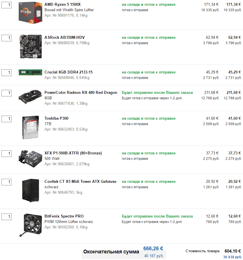 Большое спасибо за помощь! Корпус возьму в ситилинке, в городе магазин есть. Процессор со штатным кулером пока поработает, позже докуплю и попробую в разгон - типа апгрейд будет В остальном: ASUS PRIME B350-PLUS; Corsair Vengeance LPX 16GB DDR4 K2; Corsair Vengeance Series V650M Netzteil; Sapphire Radeon RX 580 Pulse. В общем все, брать?