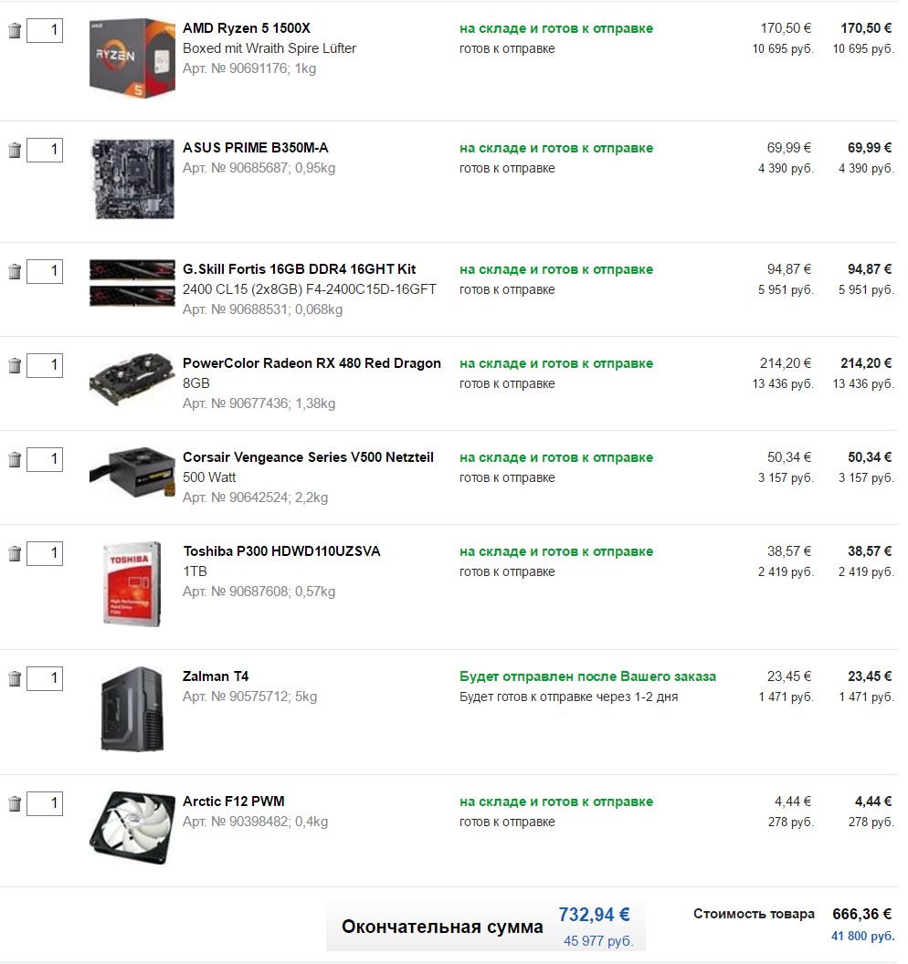 - Процессор - AMD Ryzen 5 1400 OEM Socket AM4, 4-ядерный, 3200 МГц - примерно 10 500р - Материнская плата - ASUS PRIME B350M-A - примерно 6000р - Коммент: брал с 4 слотами, чтобы потом доставить можно было оперативной памяти. Не очень уверен в выборе. - Видеокарта - GeForce GTX1050 Ti MSI PCI-E 4096Mb - примерно 9500 - Коммент: брал начитавшись этой статьей http://www.thg.ru/graphic/luchshaja_videokarta_dlja_igr/index.html, но вот этот скачок после GTX1050 за 9900 сразу 18000р смущает. Неужели нет ничего инетерсно в районе 15 000р? - Оперативная память - 16Gb DDR4 3200MHz Corsair Vengeance LPX - Коммент - что то оперативная память по ощущениям стала дороговата. Может я не туда смотрю? Есть ли DDR4 16Гб нормального качестве подешевле? - Блок питания - сколько мощности нужно? - Корпус - посоветуйте пожалуйста корпус - Жесткие диски - посоветуйте 2 диска. SSD (под систему) + HDD под данные. - Охлаждение - посоветуйте желательно не сильно шумное
