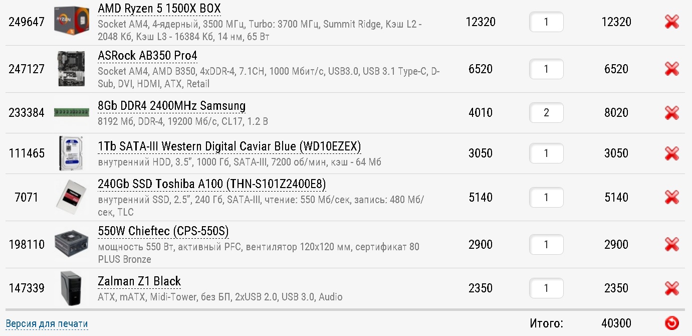 Добавлено спустя 1 час 22 минуты 26 секунд: желательно знать город, где будет всё покупаться. Если это Брянск, то можно собрать примерно так Материнская плата Gigabyte GA-A320M-HD2 4899 Процессор AMD Ryzen 5 1400 11799 Видеокарта Palit GeForce GTX 1050 Ti DUAL OC [NE5105TS18G1-1071D] 9299 Оперативная память Crucial [CT8G4DFD824A] 8 ГБ 3750 Блок питания Cougar STX 450W [STX450] 3099 Характеристики Корпус Zalman T2 PLUS черный 1599 1 ТБ Жесткий диск Toshiba P300 2999 итого 37444 или с Видеокарта MSI GeForce GTX 1060 OC [GTX 1060 3G OC] примерно 41к, но это стоит 1-2к сверху бюджета Возможна покупка ssd на 120 гигов вместо жёсткого диска[/quote] Город Касимов, Рязанская область. Цены не сильно отличаются. Спасибо за конфигурацию, буду думать. В принципе бюджет можно увеличить не сильно.