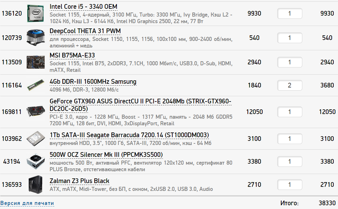 Evgeny regard Оперативная память 8Gb DDR-III 1600MHz Hynix Original 3420 Корпус Zalman Z11 Black 3260 Блок питания 500W EVGA 500B (100-B1-0500-KR) 2820 Материнская плата Gigabyte GA-P61A-D3 2440 (возможно придётся перешивать биос) Жесткий диск 1Tb SATA-III Western Digital Caviar Blue (WD10EZEX) 3190 Кулер DeepCool THETA 21 PWM 450 Видеокарта nVidia GeForce GTX960 MSI Armor 2X PCI-E 2048Mb (GTX 960 2GD5T OC) 11300 Процессор Intel Core i5 - 3340 OEM 9930 итого 37к если много, то вместо Корпус Zalman Z11 Black 3260 и Блок питания 500W EVGA 500B (100-B1-0500-KR) 2820 - Корпус AeroCool Strike-X Coupe 600W 4000 итого 35к