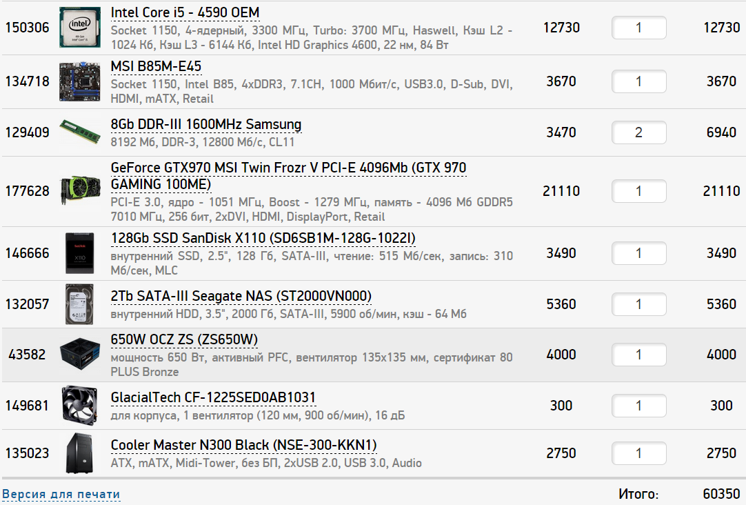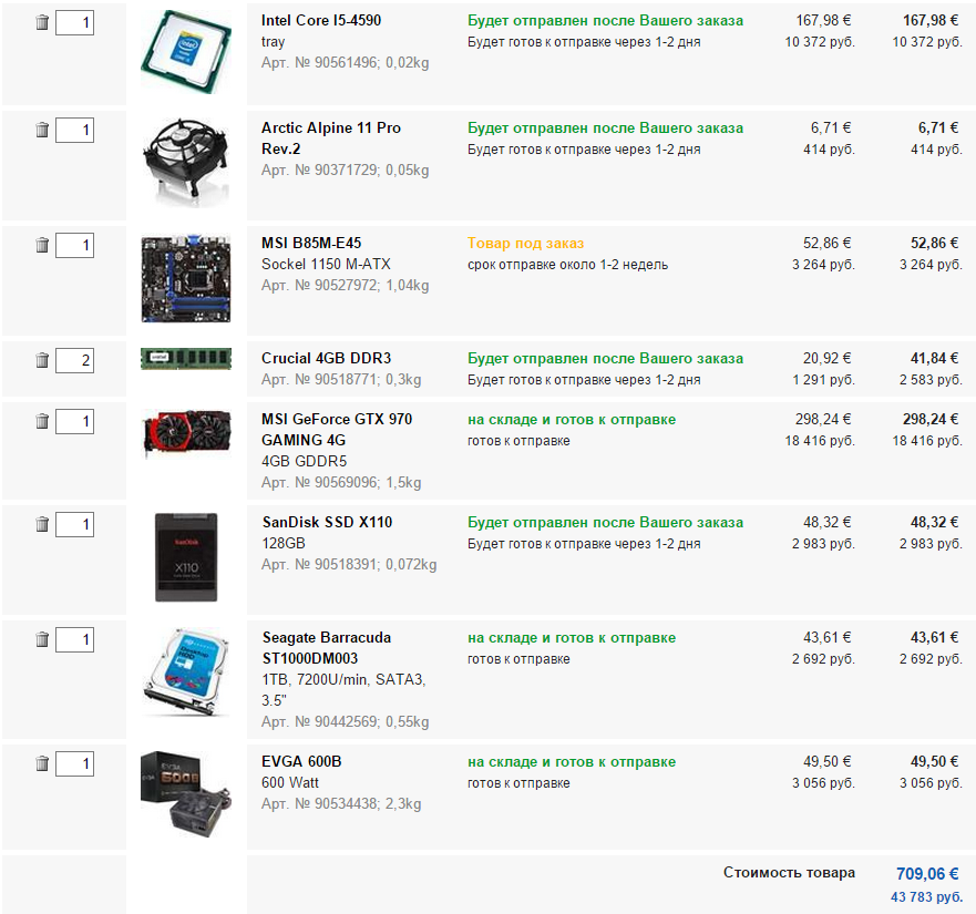 1) Бюджет - 650 +/-20 евро, это 41-43к примерно 2) Линк(и) на прайс магазина(ов) - http://moblive.lv/ , http://www.dataleks.lv/ 3) Что собираетесь брать: - Только системник 4) Указывайте для каких задач берётся сабж. а) Для игровых систем: Под гта онлайн. Моник на 19 (1440-900) 5) Уточняйте планируете ли Вы разгон системы. - Нет 6) Уточняйте планируете ли Вы апгрейд системы в ближайшие 6 месяцев. - Хотелось бы докупить 8 гигов оперативки. 7) Если у Вас есть какое-то железо, которое Вы ещё планируете использовать. - Есть трехлетний ссд от кингстон, хотел его в новый поставить или же в будущем докупить. 8) Если у Вас есть какое либо требования, уточняйте: Желательно на базе интел, чтобы видюха кушала поменьше. 9) Наброски конфигурации ПК - Ссылка сверху, все ли там подходит?