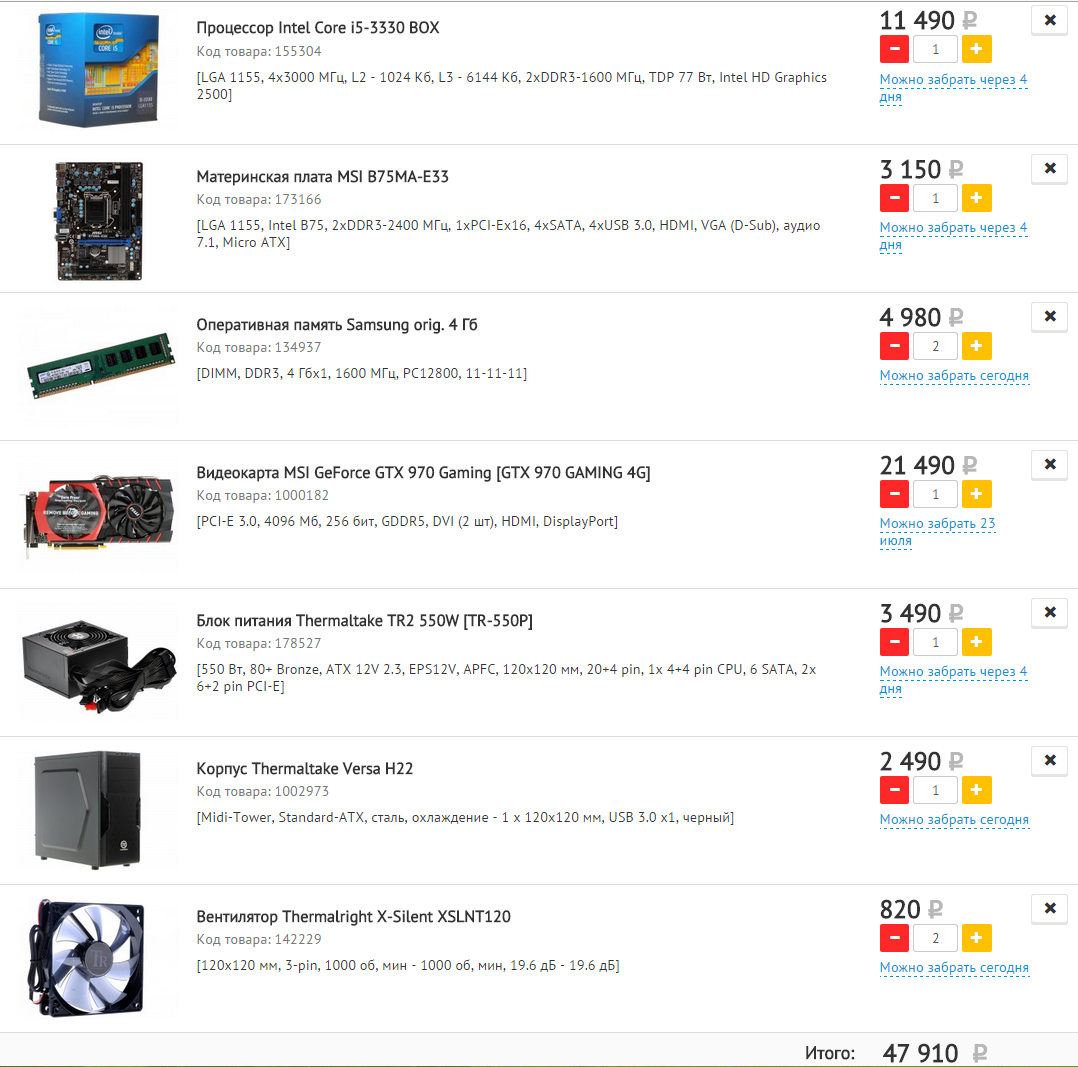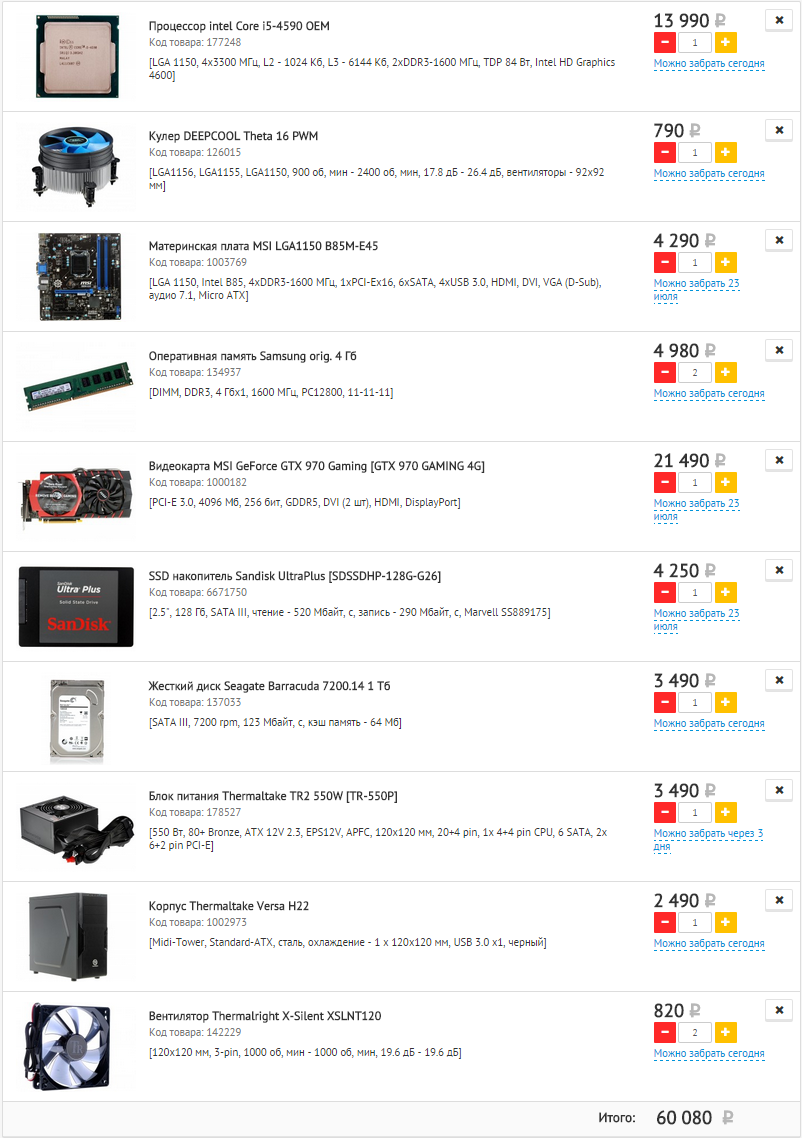 Попробовал собрать сам, получилось следующее: Процессор intel Core i5-4690 OEM Материнская плата MSI B85M-G43 Кулер DEEPCOOL Ice Blade PRO Оперативная память Crucial CT102464BA160B 8 Гб Видеокарта MSI GeForce GTX 970 Gaming [GTX 970 GAMING 4G Жесткий диск Toshiba DT 01ACA100 1 Тб Блок питания Corsair CX 600W [CP-9020048-EU] Корпус AirTone GF-7206B 59620