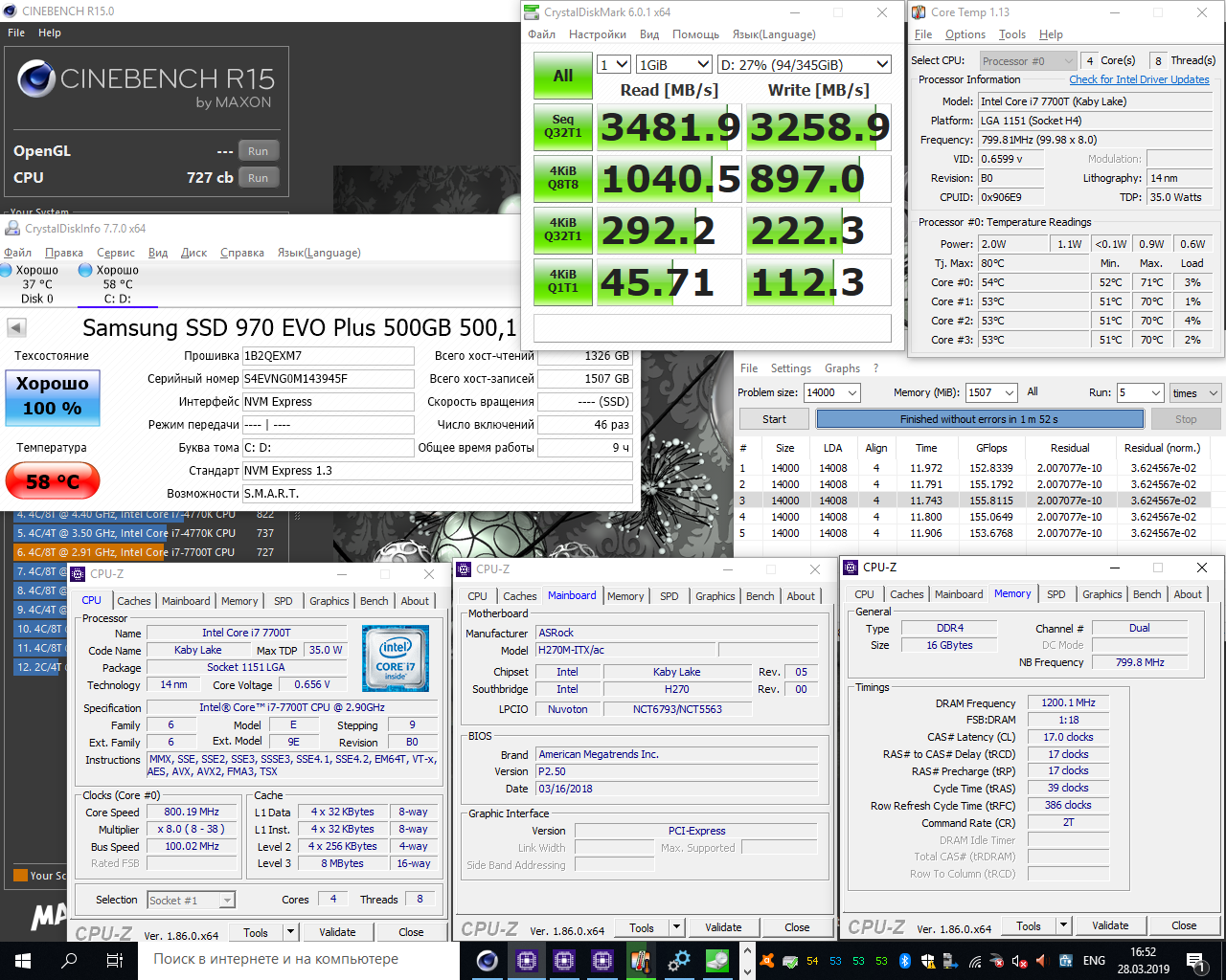 Заодно перешел с SATA SSD на Samsung 970 EVO Plus, который без обдува даже на открытом стенде греется неслабо. Налепил на него 4 радиатора для видеокарточных чипов памяти, стало лучше, в 5-минутном тесте CrystallDiskMark температура упала с 75 до 65 градусов, в более быстрых тестах обычно в 60 градусов укладывается.