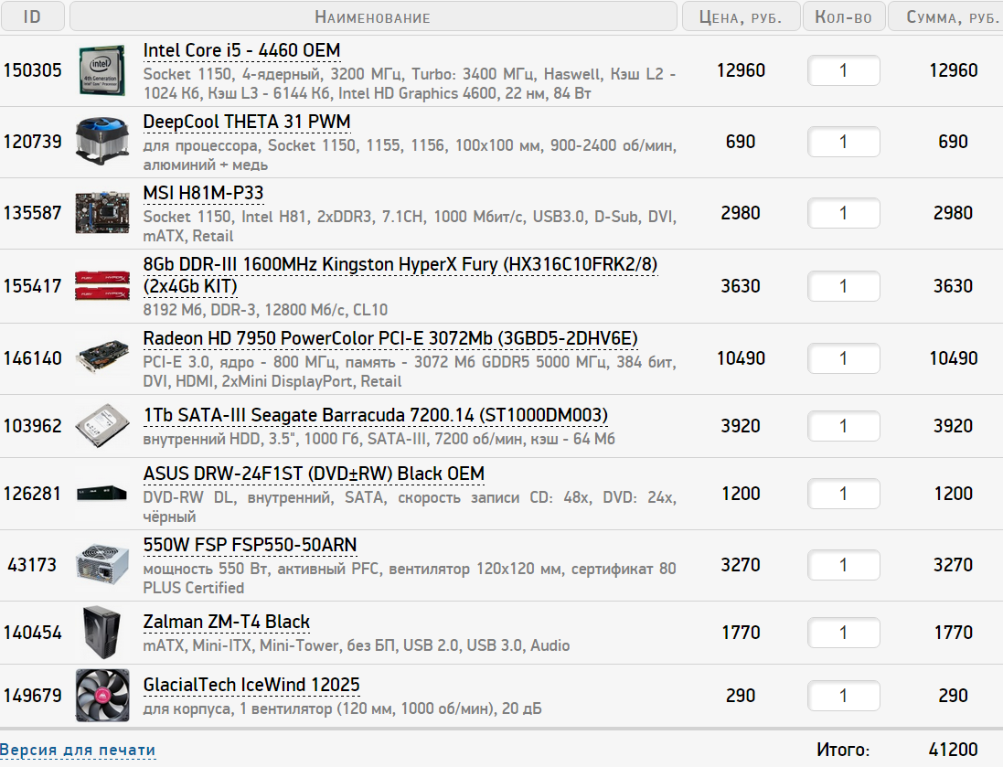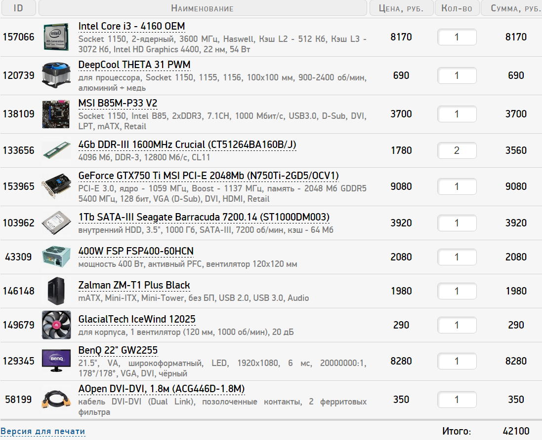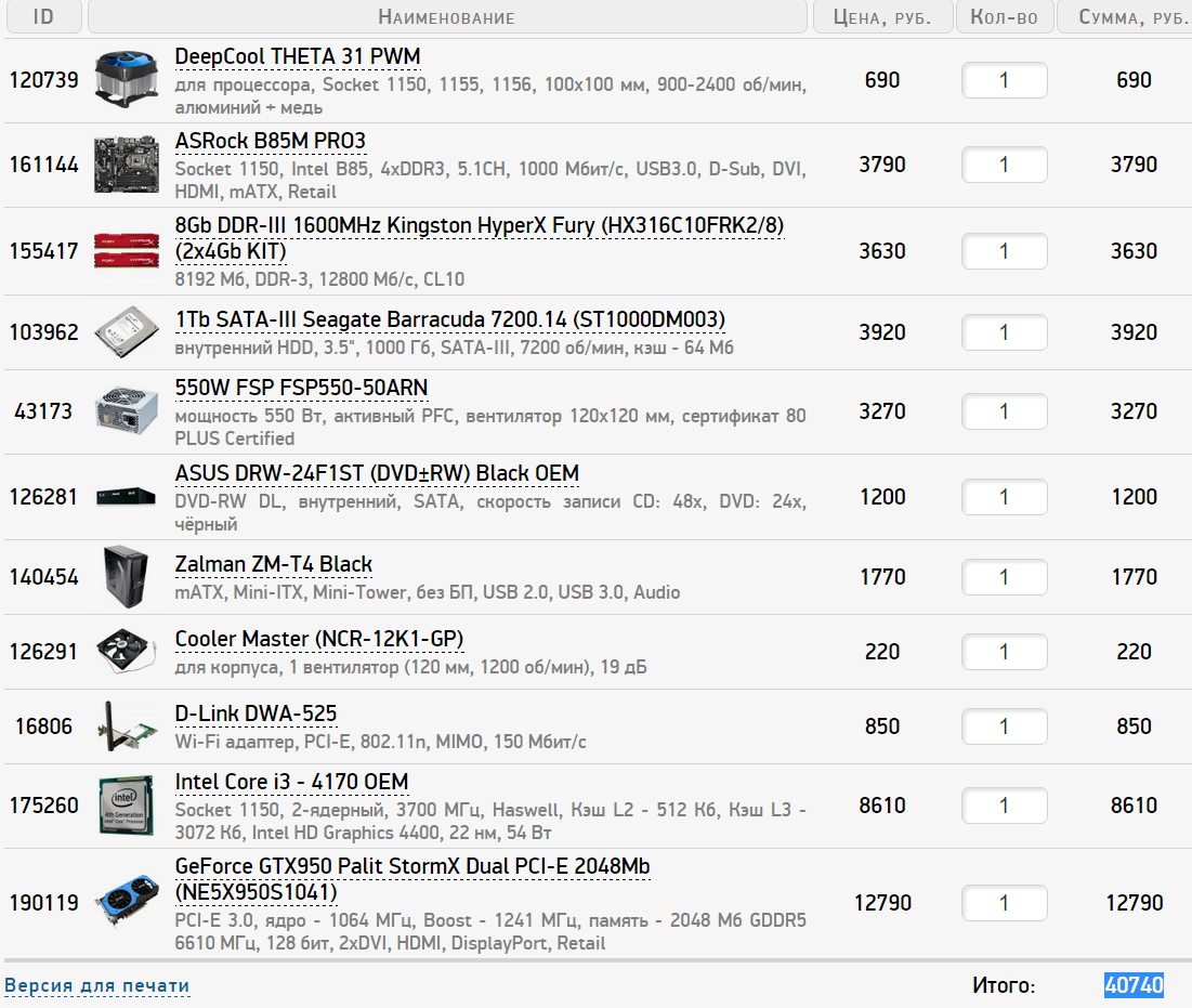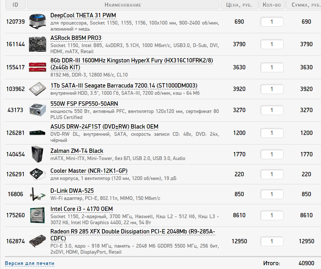 underketzer Такие кулера есть в Ситилинке. Насчет Cooler Master Hyper 101 PWM - можно и его, но не нужно для неразгоняемого процессора, все-таки на максимальных оборотах он будет слишком шумным. Обычно кулера башенного типа берут под разгон процессора, но там нужны кулера совсем другого ценового диапазона. Если удешевлять процессор, БП, корпус, видеокарту, то : http://www.ulmart.ru/goods/3471265 http://www.ulmart.ru/goods/549427 http://www.ulmart.ru/goods/589930 Если брать карту AMD, то БП брать лучше мощнее, чем NV, для какой-нибудь GTX 750 Ti подойдет FSP PNR 500 w. Насчет корпуса : совсем дешевые корпуса за 2-2,5К следует обходить стороной, там и металл как консервная банка и предустановленных вентиляторов нет, если в них ставить нормальные корпусные кулера, то на то и выйдет.
