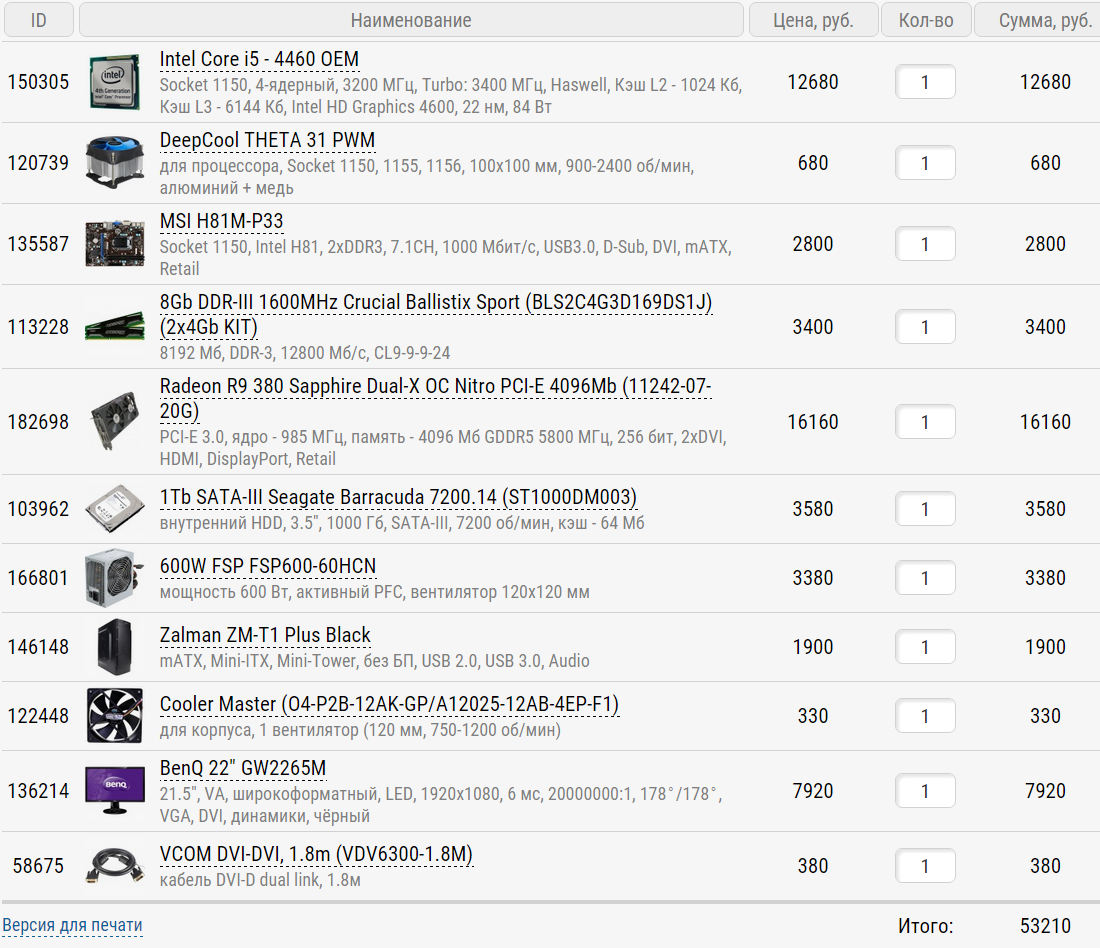 1) 20-22 тыс грн 2) http://vision.kh.ua/catalog/223/ 3) - Ситемник и монитор 4) GTA ,WOT 5) Разгон не критичен, прошлую сборку брал под разгон но так и не гнал. 6) апгрейд не планирую 7) нет 8) желательно Intel, Nvidia 9) s1150 Asus H97M-E mATX - 2255 грн Intel s1150 Core i3-4330 (BX80646I34330) Box - 3632 грн DDR3 8GB (2x4GB) 1600 MHz CORSAIR (CML8GX3M2A1600C9W) - 1651 грн 3.5" SATA 1Tb Seagate Barracuda 7200.14 64Mb (ST1000DM003) - 1266 грн GF GTX960 Gaming 2Gb DDR5 MSI (GTX 960 GAMING 2G) - 5862 грн ZALMAN Z3 Plus (Black) + БП ZALMAN ZM500-LE 500W - 2119 грн