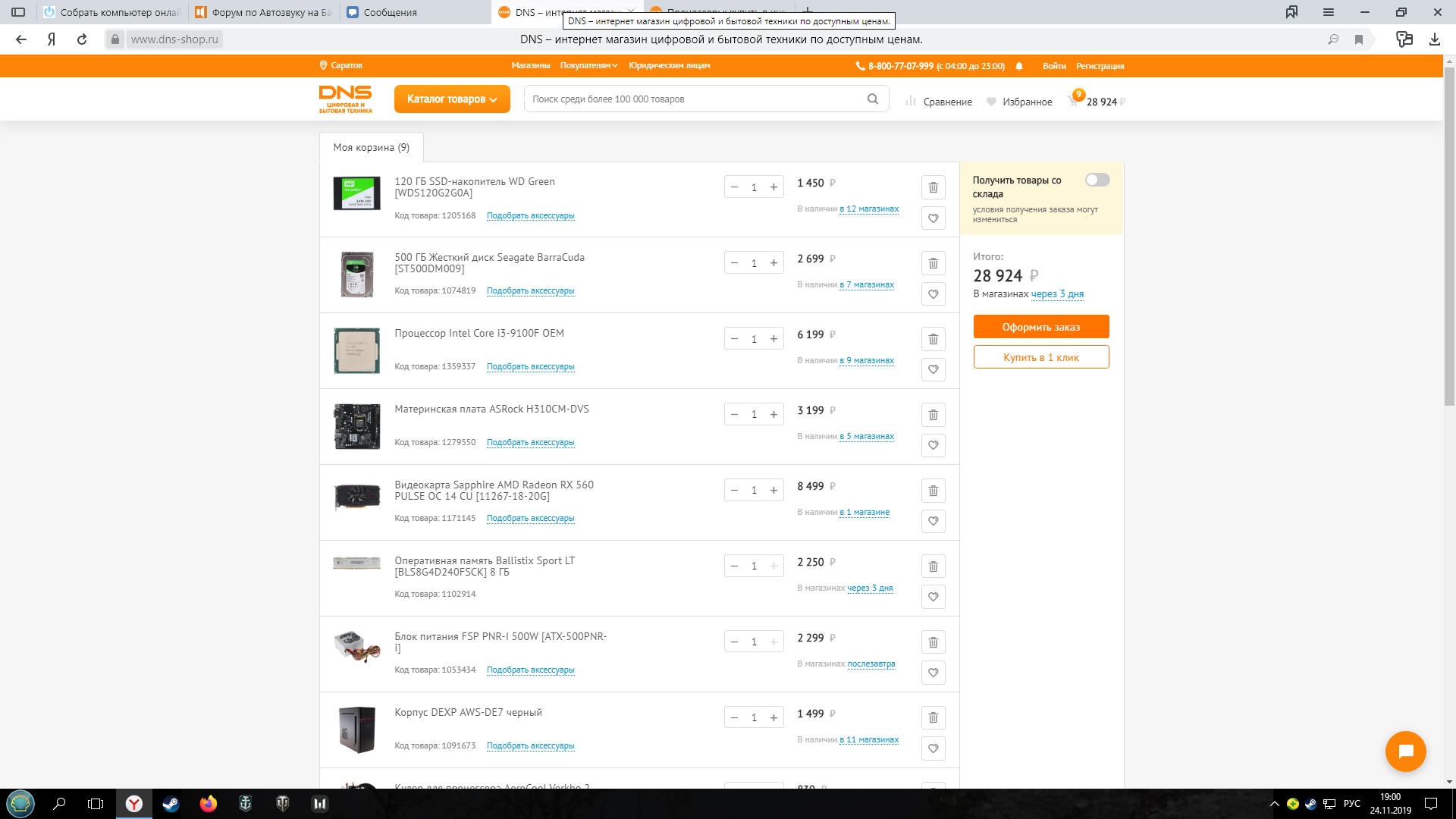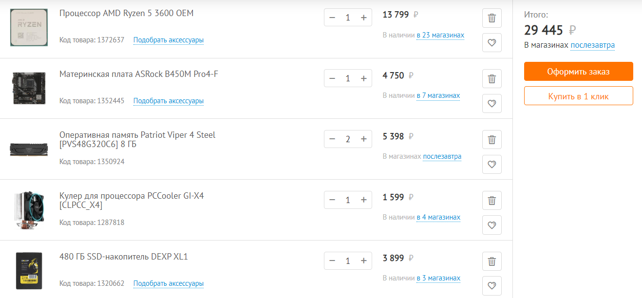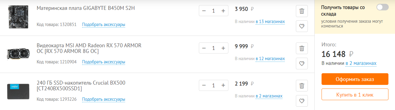 не знаю какой город, но я бы посмотрел в сторону б/у видюхи и б/у харда. покупать за 2600р 500гб hdd- жаба душит. если брать то хотя бы 1Тб. за 3200р в москве ссд adata 480gb уже можно взять https://market.yandex.ru/product--tverd ... ext=search