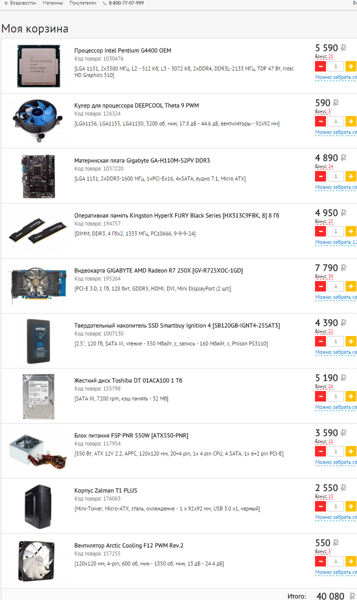 1) До 40 000 рублей 2) http://www.dns-shop.ru/ Владивосток 3) Только системный блок 4) Учеба, интернет, фильмы, не требовательные игрушки 5) Разгон системы не планирю 6) Апгрейд не планируется 7) Железа никакого нет 8) Брендовых предпочтений нет 9) Отстал от жизни и даже примерно не представляю от чего оттолкнутся. Может стоит больше вложить в связку материнская плата и процессор и обойтись без видекарты для моих требований наверное вполне хватит и встроенной графики? Надеюсь на вашу помощь и ваш опыт. Заранее спасибо.