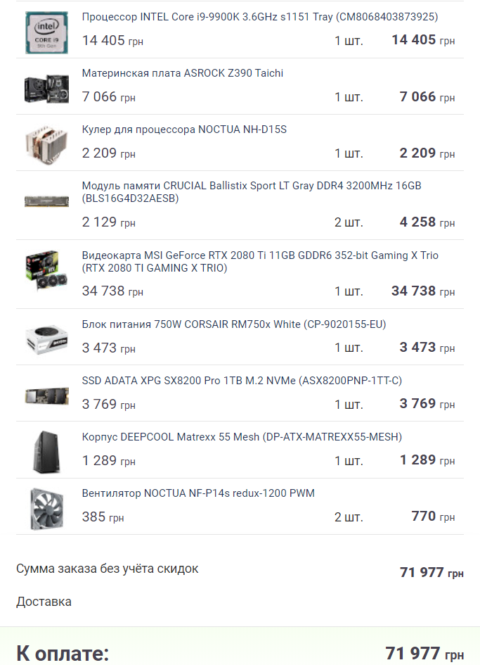 Насобирал тут вот такое чудище: MSI GeForce RTX 2080 Ti GAMING X TRIO Intel Core i9 9900КF, если хватит денег возьму KS Мать - Asus ROG MAXIMUS XI HERO RAM - Crucial 32 GB (2x16GB) DDR4 Ballistix Sport LT 3200cl16. Можно было бы взять 3200cl14, но на 32гб она слишком дорогая. Есть смысл переплачивать? SSD - Samsung 970 EVO Plus M.2 500гб - для системы и игр. HDD - WD Blue 2tb x2 - два, а не один на 4tb потому что если вдруг 1 сломается, то повредятся не сразу все файлы. Corsair RMx Series 750 Вт или EVGA SuperNOVA 750 G3 не знаю какой из этих двух лучше и почему. Охлаждение цп - Corsair Hydro Series H150i PRO RGB - вроде норм. Корпус Aerocool Aero One Frost - влезет в него видеокарта? Видеокарта в длину 327 мм, а у корпуса указано макс. длина видео 327 мм. Прям впритык ПК естественно для игр в 4к. Бюджет 2500$, но по предварительным подсчетам я уже превысил его. Но я могу ещё докинуть сверху 500$, но это не очень желательно. Что можно здесь заменить чтобы в цене выиграть, конечно же не в ущерб производительности (особенно скорости SSD!) Или что можно здесь заменить чтобы выиграть в производительности, но не превышая 3000$? Покупать буду в разных интернет магазинах - где дешевле там и брать. Я с Украины здесь это нормально.