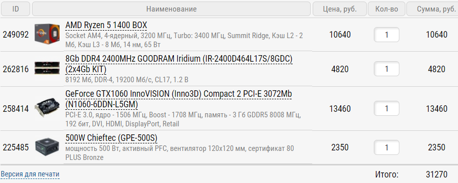 Добрый день! Прошу помощи! 1) Бюджет 35000 2) СПб, https://www.citilink.ru, http://www.ulmart.ru. 3) Что собираетесь брать: - Только системник 4) Указывайте для каких задач берётся сабж. для игр 1080р на средних/высоких настройках, также использование Photoshop и Coral draw. 5) нет 6) Уточняйте планируете ли Вы апгрейд системы в ближайшие 6 месяцев. После НГ могу докинуть 15 000 руб. 7) монитор Самсунг s27d590, БП thermaltake 1200w bronze, жёсткий диск. 8) Если у Вас есть какое либо требования, уточняйте: Не сильно шумный 9) Наброски конфигурации ПК Нет