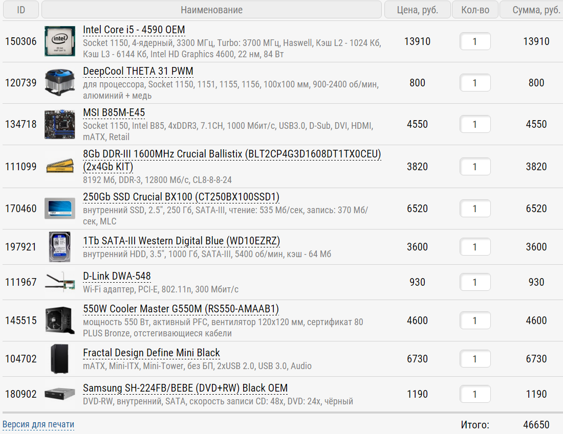 Intel Core i3 - 4150 OEM MSI B85M-E45 DeepCool THETA 20 2x4Gb DDR-III 1600MHz Hynix Original 240Gb SSD SmartBuy Ignition 4 (SB240GB-IGNT4-25SAT3) 1Tb SATA-III Western Digital Caviar Blue (WD10EZEX) GeForce GTX650 MSI PCI-E 1024Mb (N650-1GD5/OCV1) 450W SeaSonic SSR-450RT Silverstone Temjin TJ08B-E Black Microsoft Wireless Desktop 800 USB Black (2LF-00012) Samsung SH-224FB/BEBE (DVD+RW) Black OEM