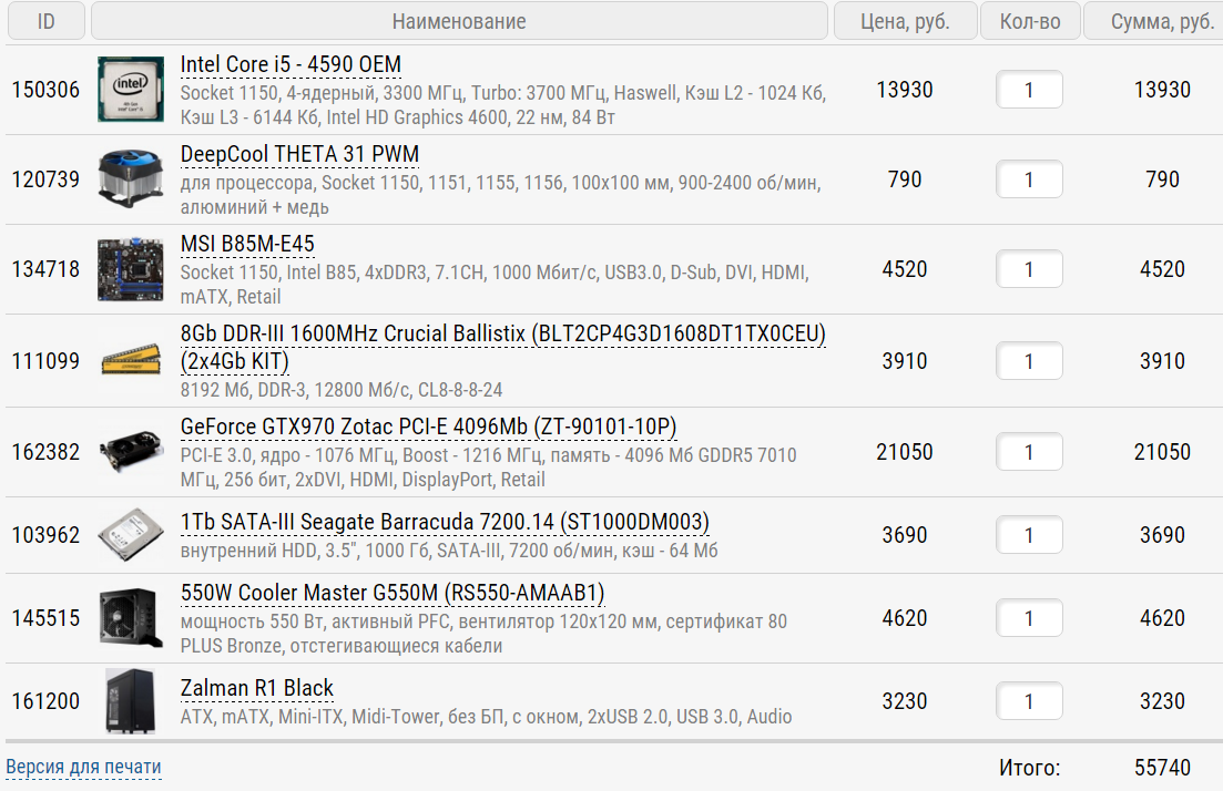 sobolek, прекрасно понимаю ваши пожелания, но рекомендую учитывать также и то, что не стоит экономить на кач-ве, гарантийном сроке и комфорте работы компонентов. Вы можете взять 970-ую из категории референсов и дешевок, которые откажу через пару месяцев, но я бы вам хотел посоветовать следующий конфиг, построенный не только с учетом производительности, но и большего долголетия, без нареканий на "пение" дросселей и вентиляторов: