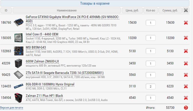 Приветствую форумчане! 1.Бюджет около 50-55 к руб макс. ,лучше конечно дешевле 2.Москва\Ситилинк http://www.citilink.ru/catalog/computer ... oks/parts/ \Регард http://www.regard.ru \+ваша рекомендация 3.Планируется системник в указанную сумму(50) + макс.10-12 к на монитор 23" 1920х1080(рекомендация приветствуется) 4.интернет ,фильмы,последние игры,фотошоп,офисные приложения 5.Разгон не планируется 6.в ближайшие годы точно нет 7.слишком устарело 8.Предпочтение intel i5 + Nvidia 960\ не принципиально ,но приветствуется по возможности - 16 gb оперы\небольшой ссд \hdd желательно 2 тб\ корпус с встроенным картридером и входами usb 3.0 на верхней крышке(встречал как то подобное в виде некоего блока в составе самого корпуса)Wi-fi карта в мп,(не свисток) на вскидку вариант системы из регарда(не указал охлад \ wifi адаптер\ssd\корпус наверное больше для примера)