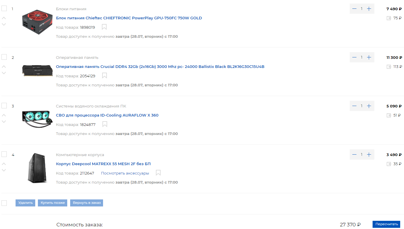 корпус - NZXT H710 - 10899 рублей проц - intel core i7-10700k (хотел kf, но он не продается) - 33399 рублей материнка - asus prime z490-p - 15099 рублей кулер процессора - noctua nh-d15 - 7699 рублей оперативка - corsair vengeance lpx 32гб (2 по 16) - 11699 рублей блок питания - corsair RMx 850W - 14499 рублей итого: 93294 (но в том же днс на комплекты скидки, поэтому реально тысяч на 5-10 дешевле) ссылка на конфиг в днс - https://www.dns-shop.ru/custompc/config ... 88eb8d404/