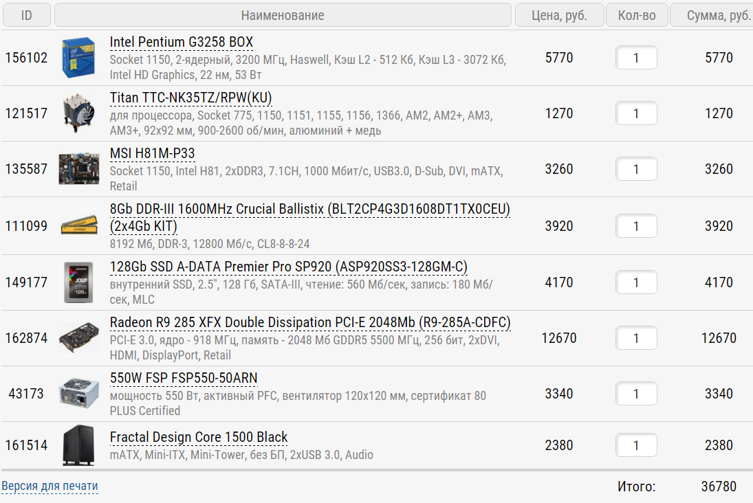 CPU - Intel Core i5-4460 МП - MSI B85-G43 (может лучше ASUS B85-PLUS или GIGABYTE GA-B85-HD3-A) RAM - Corsair CMX8GX3M2A1600C9 SSD - например, Kingston SV300S37A/240G Кулер - Deepcool GAMMAXX 300 БП - AeroCool Kcas 600 (или Zalman ZM600-GLX)