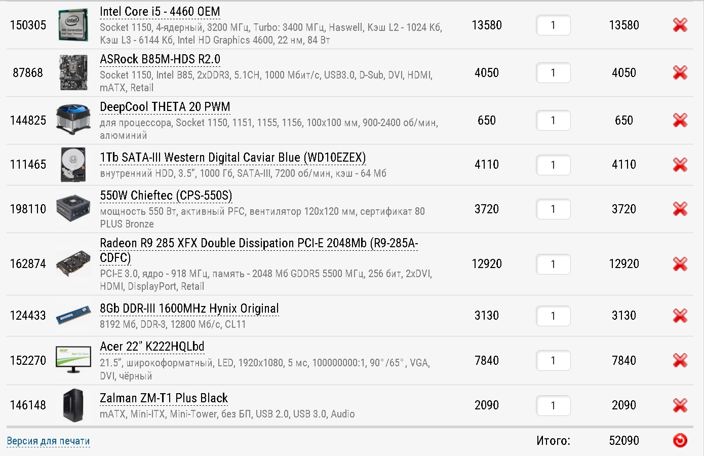 Для 1150 Проц: Intel® Core™ i5-4460 OEM 3.2GHz, 6Mb, LGA1150 Кулер: Deep Cool GAMMAXX 200 Мат. плата: MSI B85M-E45 socket 1150, Intel B85, 4xDDR3, 7.1CH, 1000 Мбит/с, USB3.0, D-Sub, DVI, HDMI Оперативная память: 2X DDR3 4Gb (pc-12800) 1600MHz Samsung Original Жесткий Диск: 1Tb Western Digital WD10EZEX Caviar Blue, SATA III [7200rpm, 64Mb] SSD диск: Crucial BX 100 120 gb, либо Transcend SSD 340, 370, 740. Оптический привод: ASUS DRW-24F1MT (DVD±RW) Black OEM Корпус: Cooler Master Elite 372 500W Black