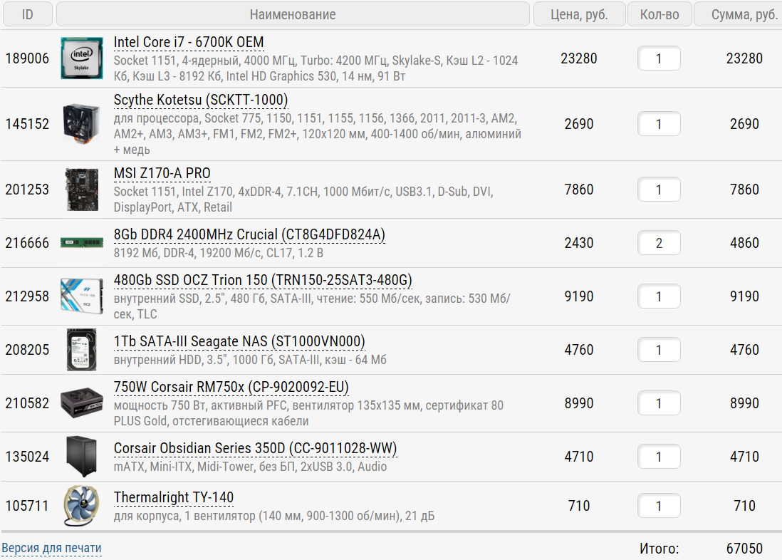 - Даже без разгона лучше не 6700, а 6700K - посмотрите внимательно на характеристики: у последнего заметно выше базовая частота. - Лучше все-таки доплатить за возможность разгона, такая сборка легко влезает в бюджет вместе с 1070 (а с нерефом 1080 выходит 90к).