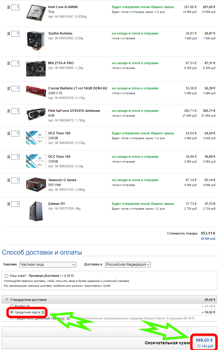 я видимо вас запутал, и сам уже запутался)) последний билд который я выложил на 859 евро (без доставки и комиссии), по сути отличается только тем что я gtx 1060 поставил а не 1070. Если второй ssd не влезет в стоимость я не расстороюсь сильно, куплю его в городе.